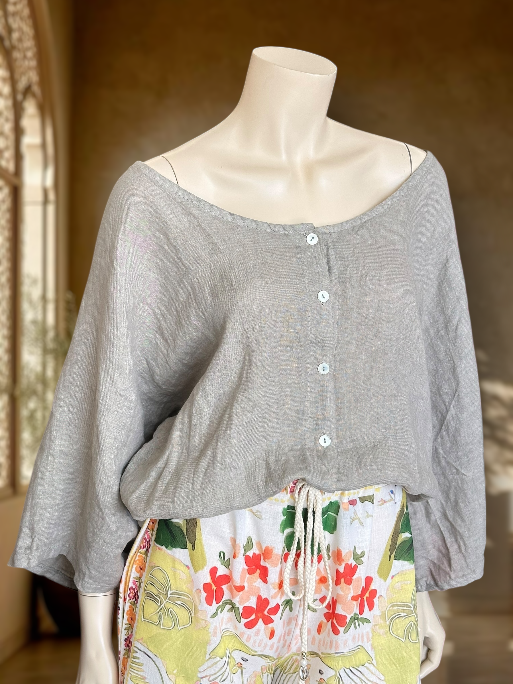 Una blusa italiana confeccionada en 100% lino premium, ligera, fresca y con un calce relajado que aporta comodidad y estilo natural. Su diseño amplio y escote sutilmente bote permiten un look effortless perfecto para días cálidos o para combinar en capas.