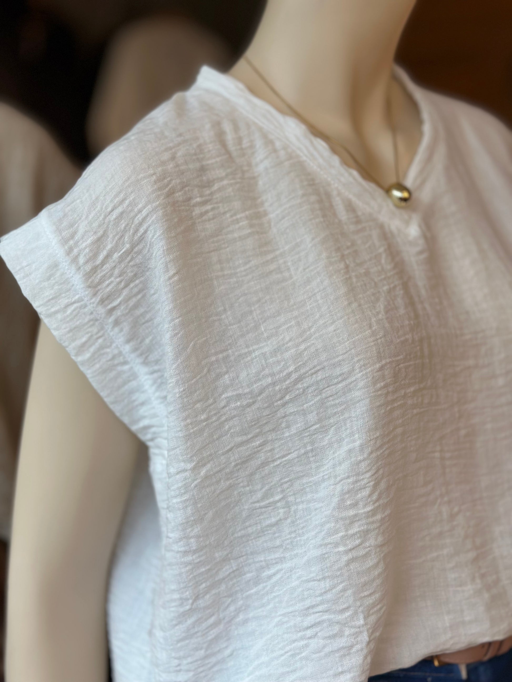 Una prenda fresca y atemporal que combina comodidad y estilo. Confeccionada en Chile en tela Look Lino, destaca por su textura ligera y suave al tacto, ideal para acompañarte en cualquier temporada. Su diseño de corte recto, manga caída y cuello en V aporta un aire relajado pero elegante, perfecto para looks casuales o más sofisticados según cómo la combines.