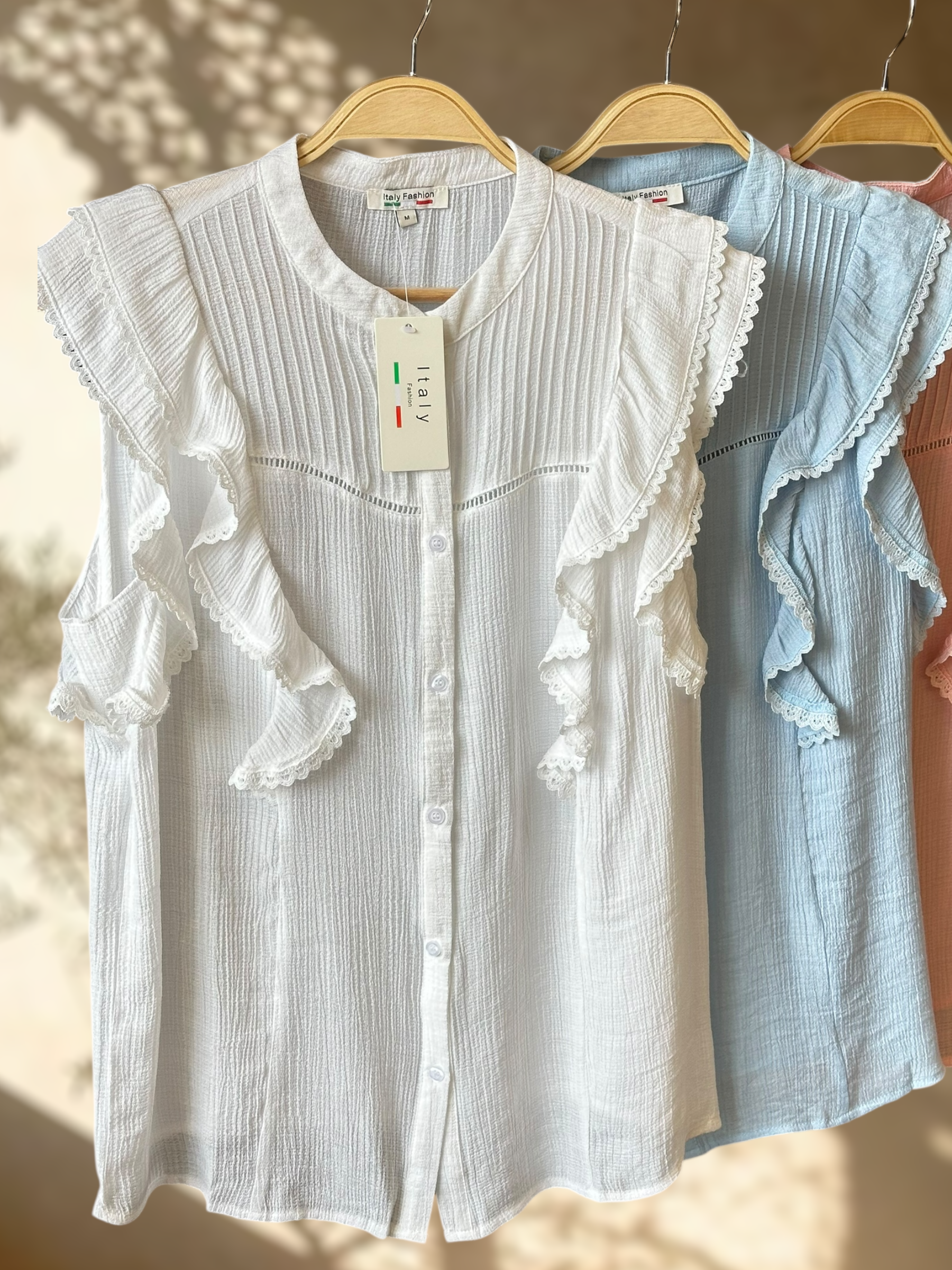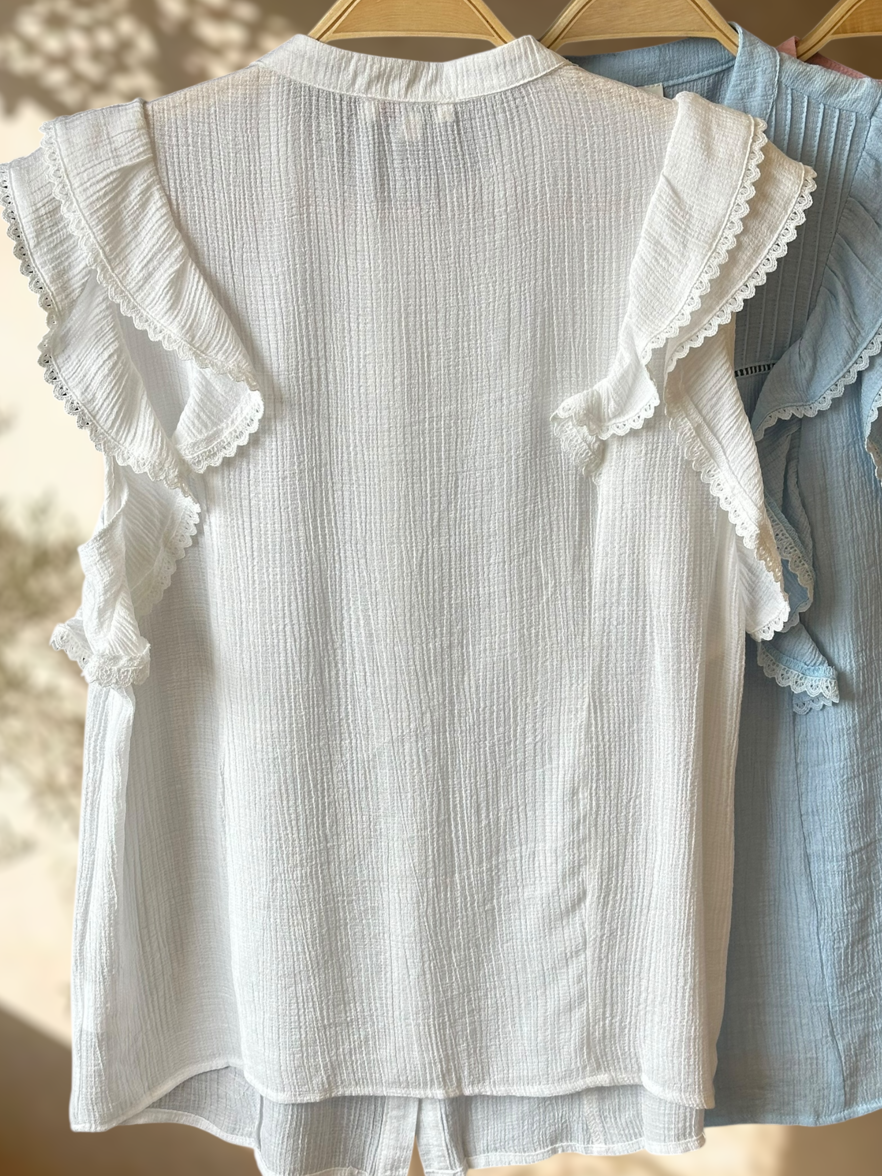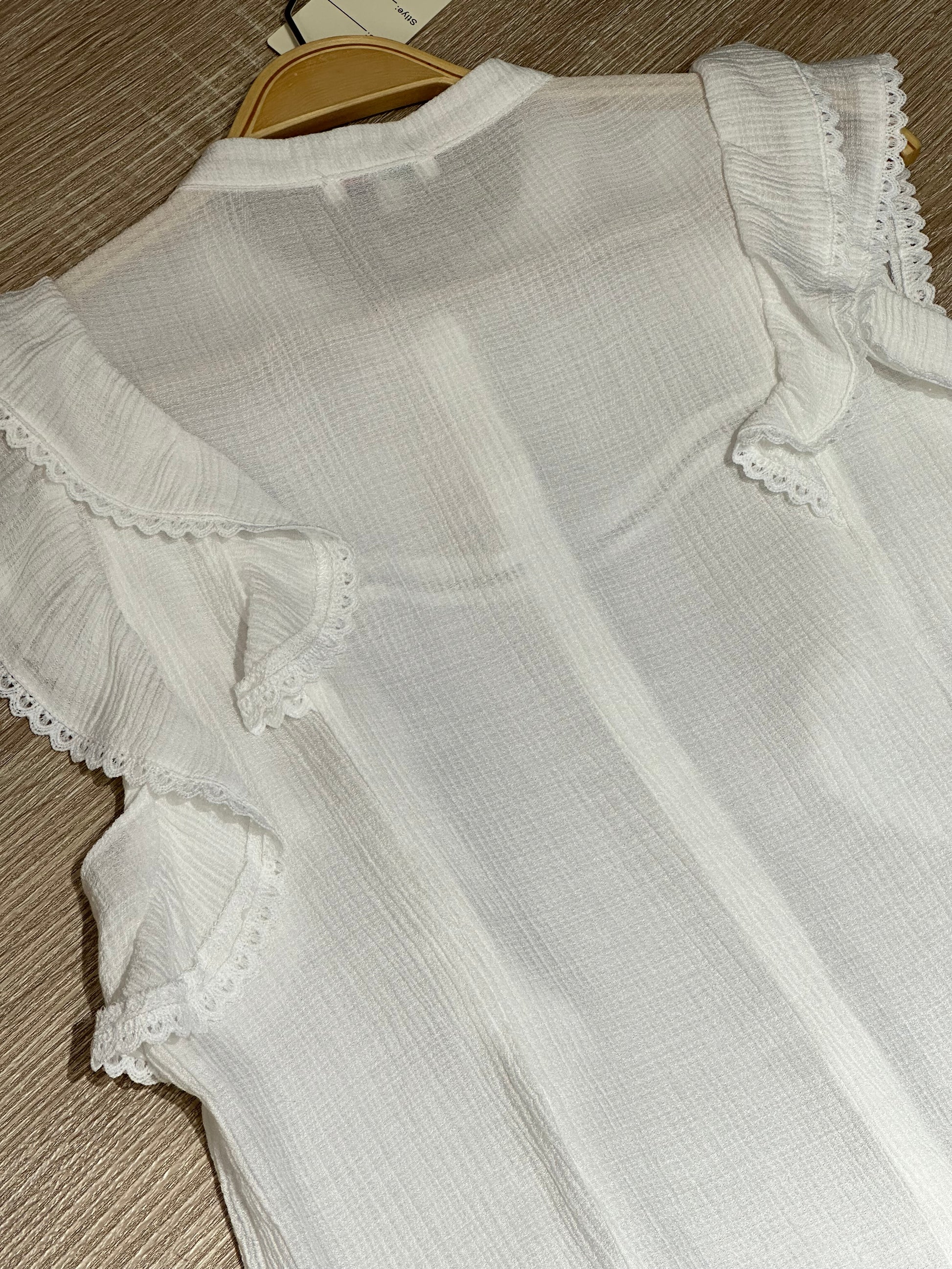 Una blusa femenina y delicada, con un diseño romántico perfecto para elevar cualquier look. Sus volantes con encaje y la textura suave del tejido le dan un aire fresco y elegante, ideal para días cálidos o para combinar en outfits más sofisticados.