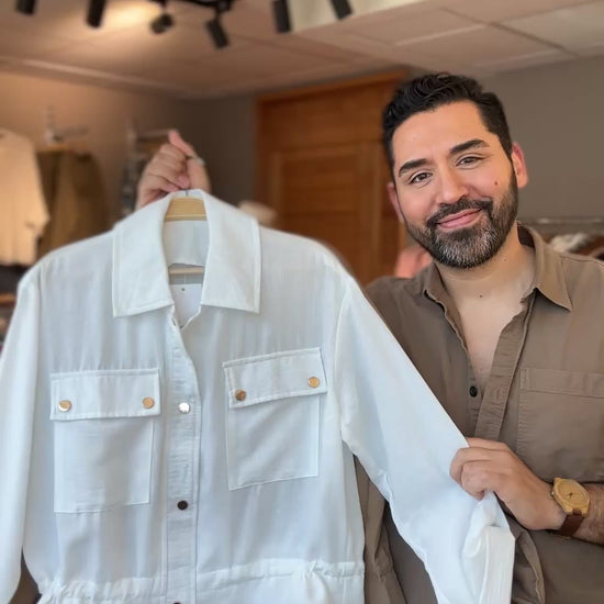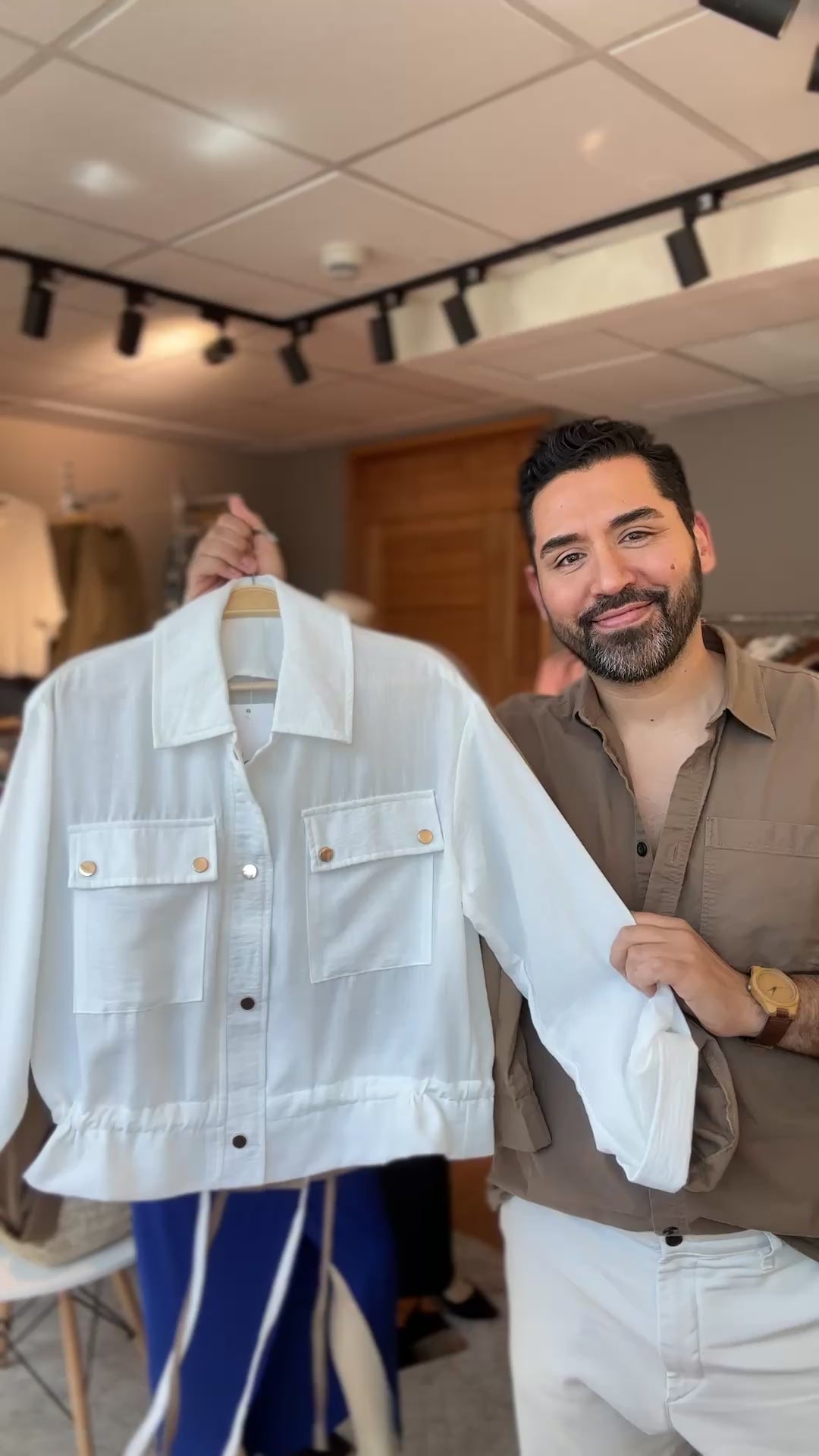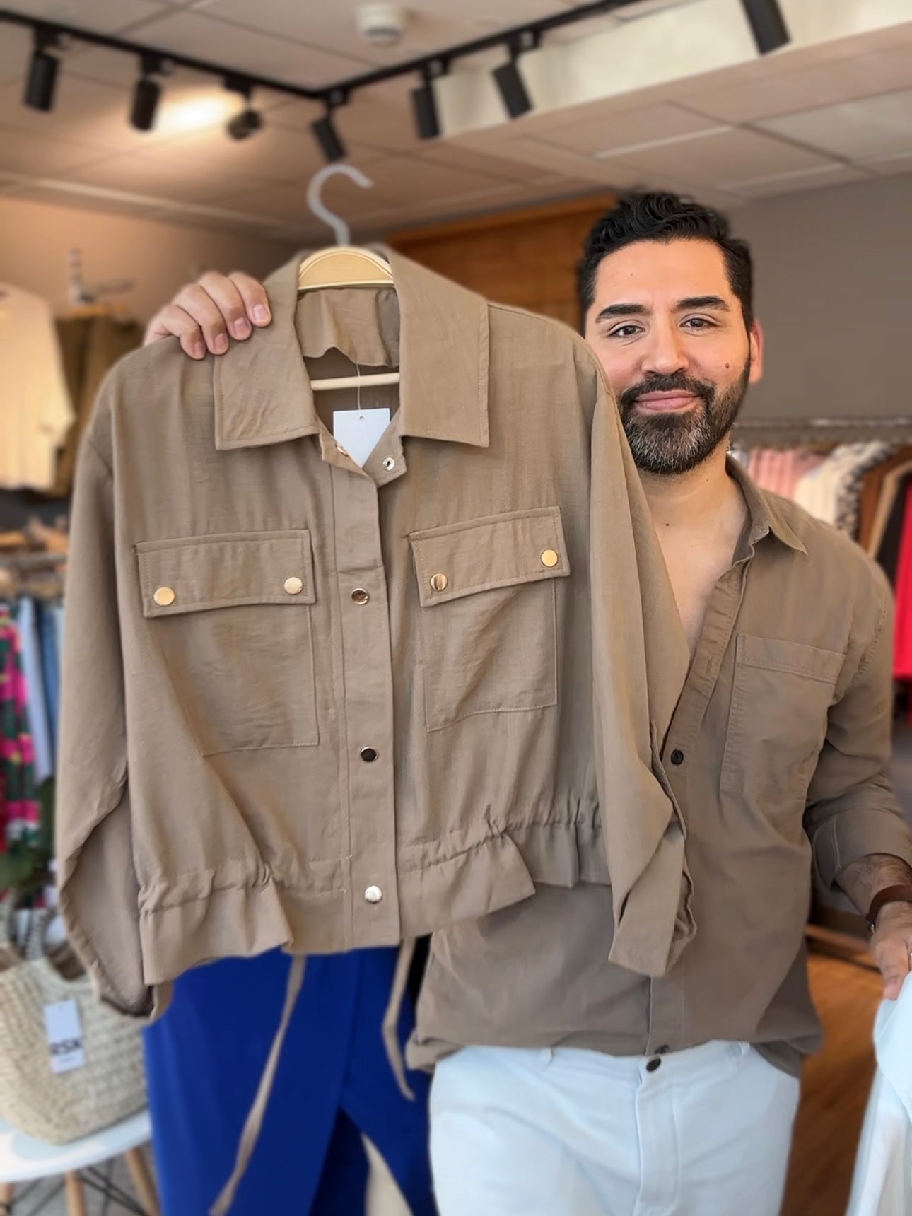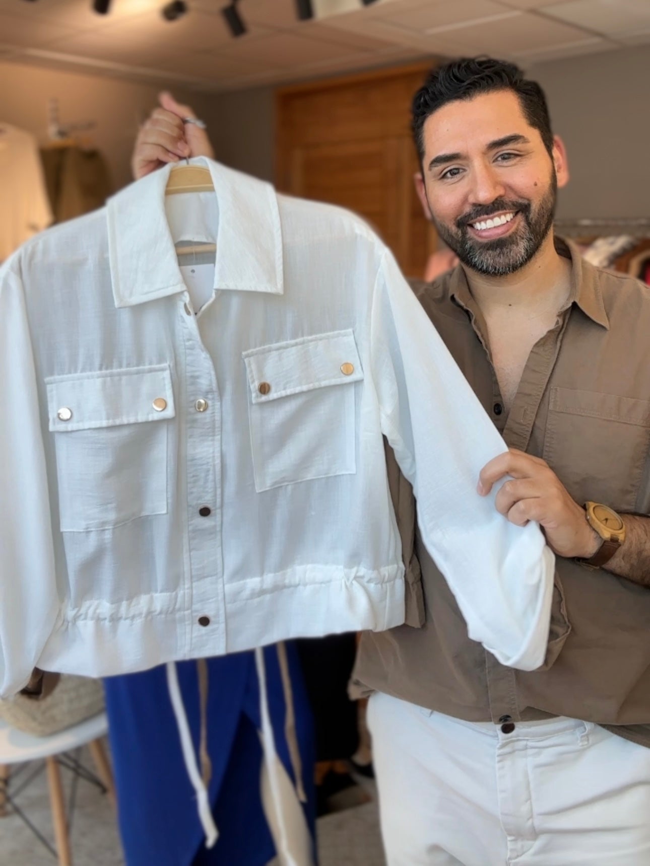 Un diseño ligero y versátil que combina el estilo relajado del lino con un corte moderno tipo bomber. Su textura fresca y cómoda lo convierte en la prenda ideal para looks de entretiempo o para dar un toque sofisticado a tu outfit diario.