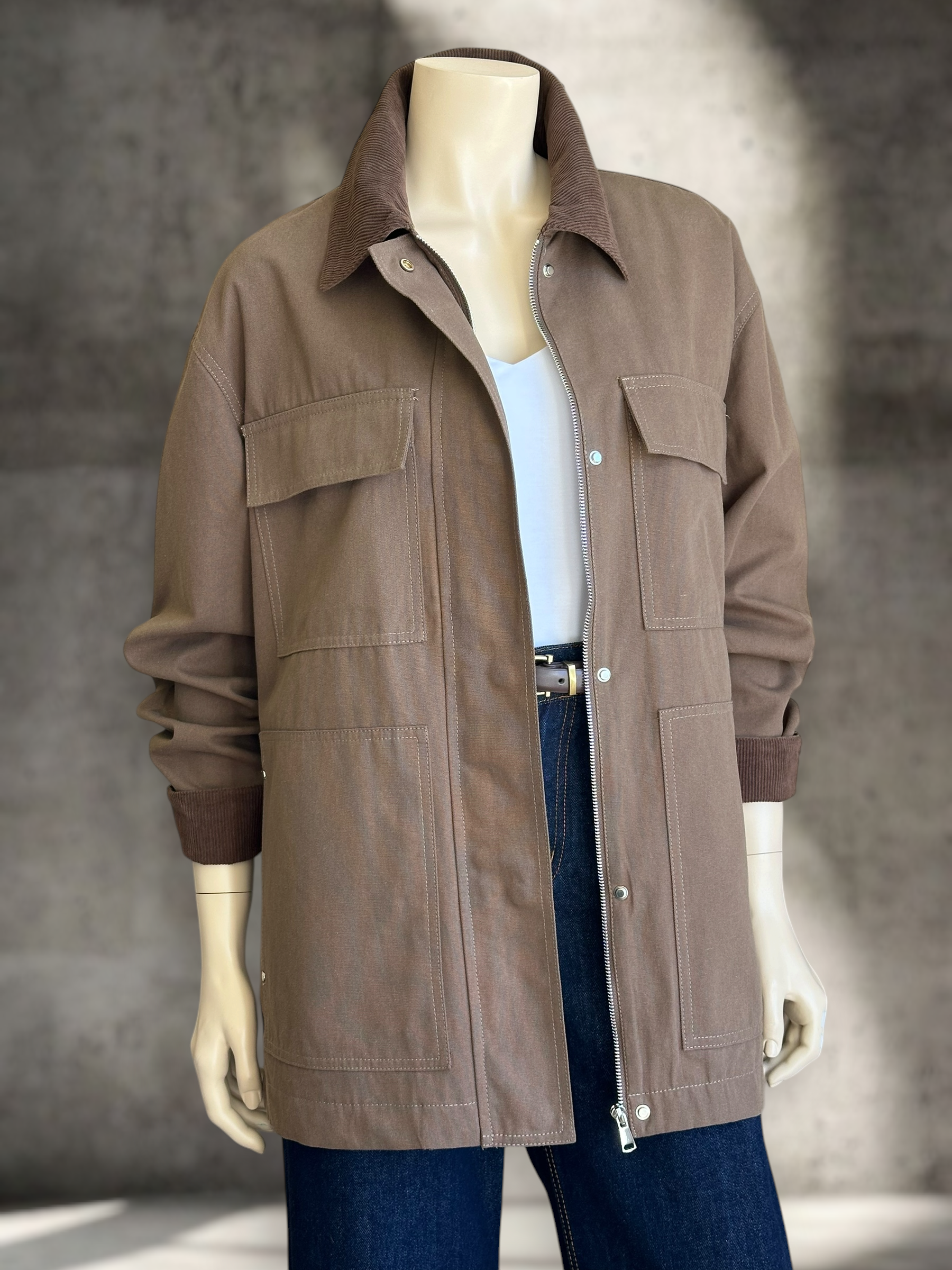 Una chaqueta clásica con inspiración italiana que combina estructura y estilo. Su diseño atemporal con cuello en contraste y calce relajado la convierte en una prenda versátil para elevar cualquier look de temporada.