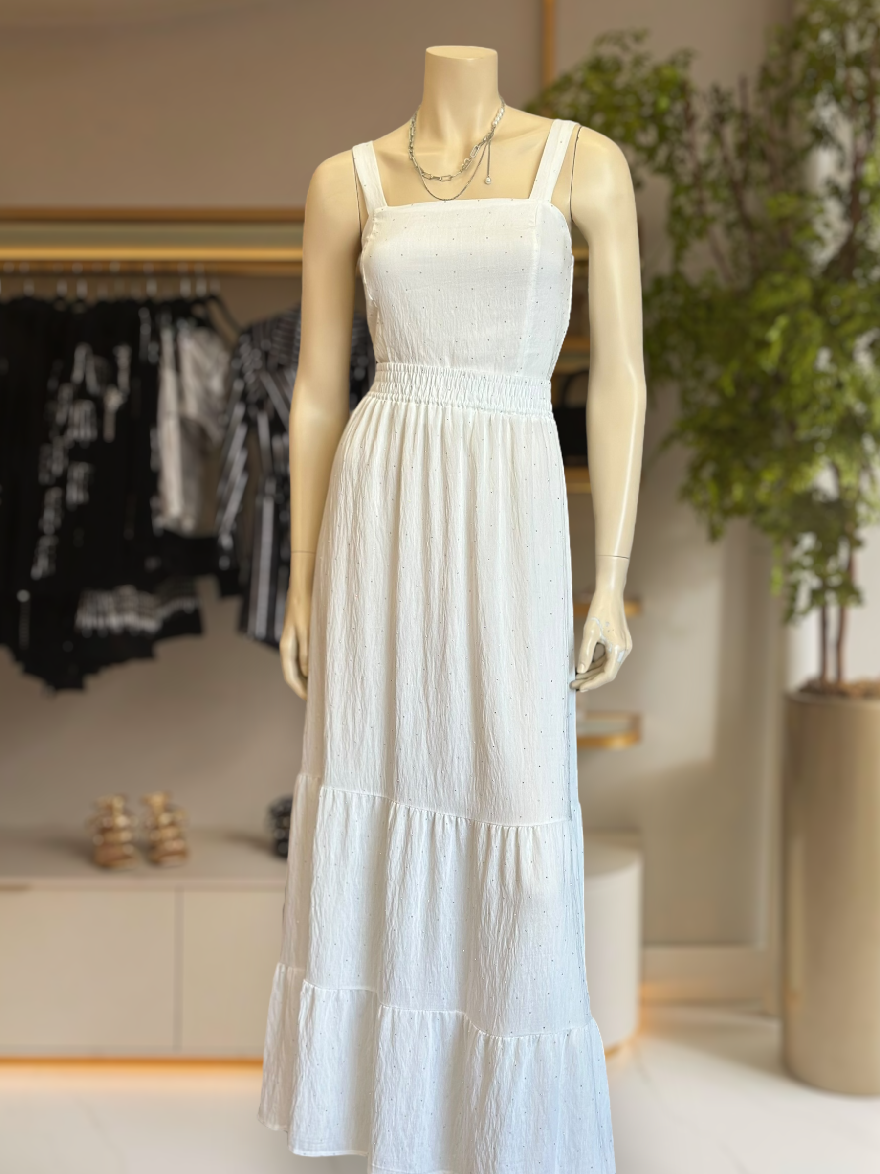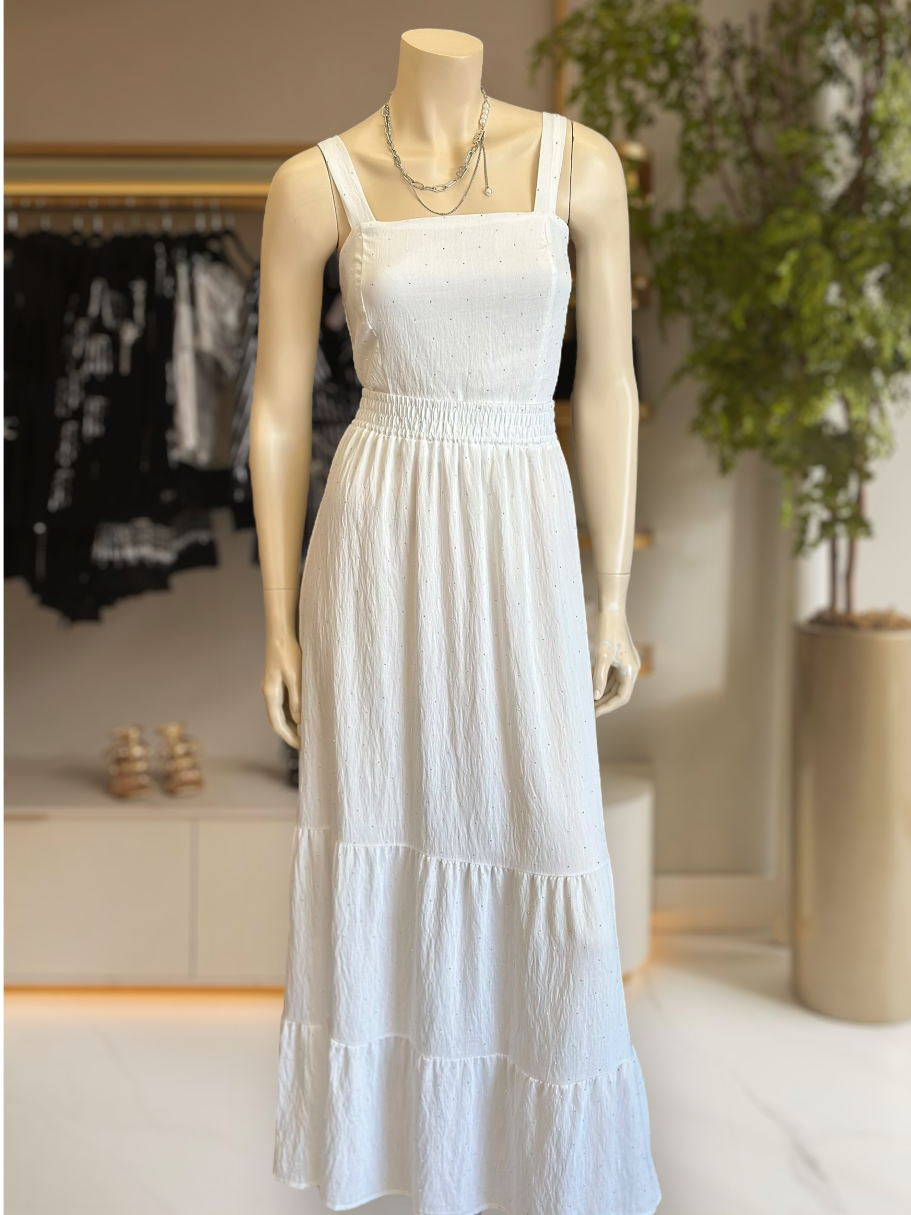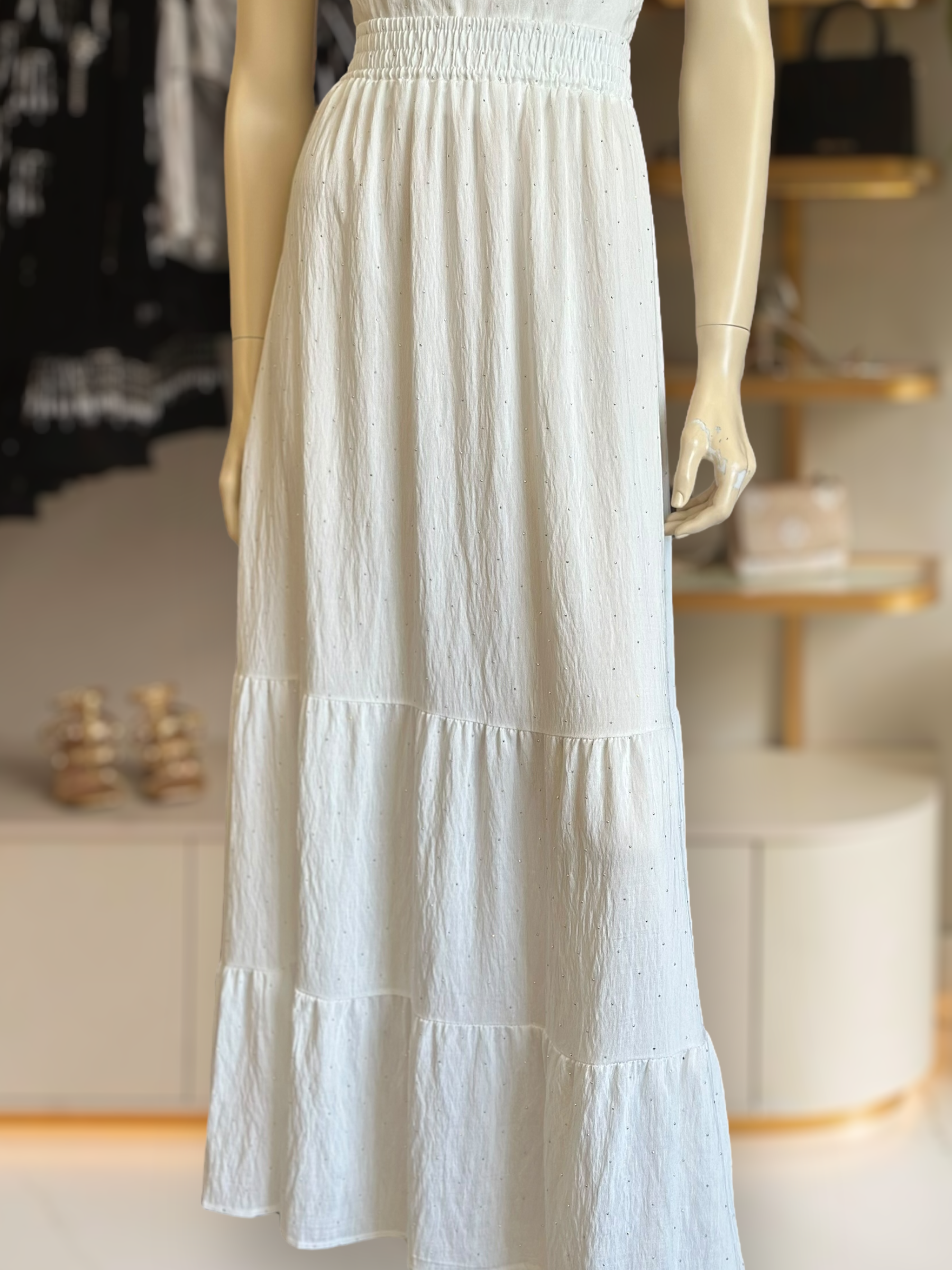 Un diseño italiano lleno de frescura y elegancia. Conjunto de top y falda larga en tela ligera con pequeños y sutiles cristales que aportan un brillo delicado y sofisticado. Ideal para un look veraniego, natural y femenino. El top tiene espalda elasticada para un calce cómodo, mientras que la falda presenta pretina elástica y caída fluida.