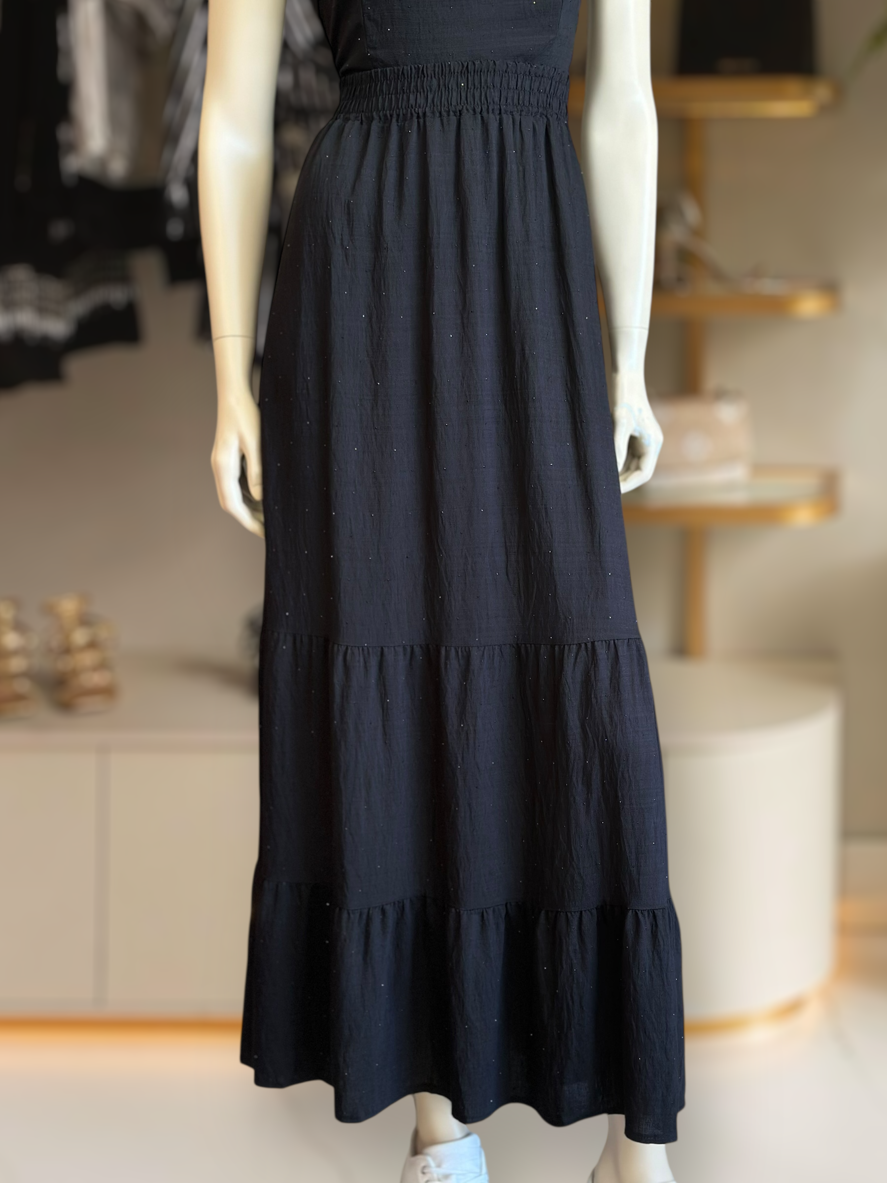 Un diseño italiano lleno de frescura y elegancia. Conjunto de top y falda larga en tela ligera con pequeños y sutiles cristales que aportan un brillo delicado y sofisticado. Ideal para un look veraniego, natural y femenino. El top tiene espalda elasticada para un calce cómodo, mientras que la falda presenta pretina elástica y caída fluida.