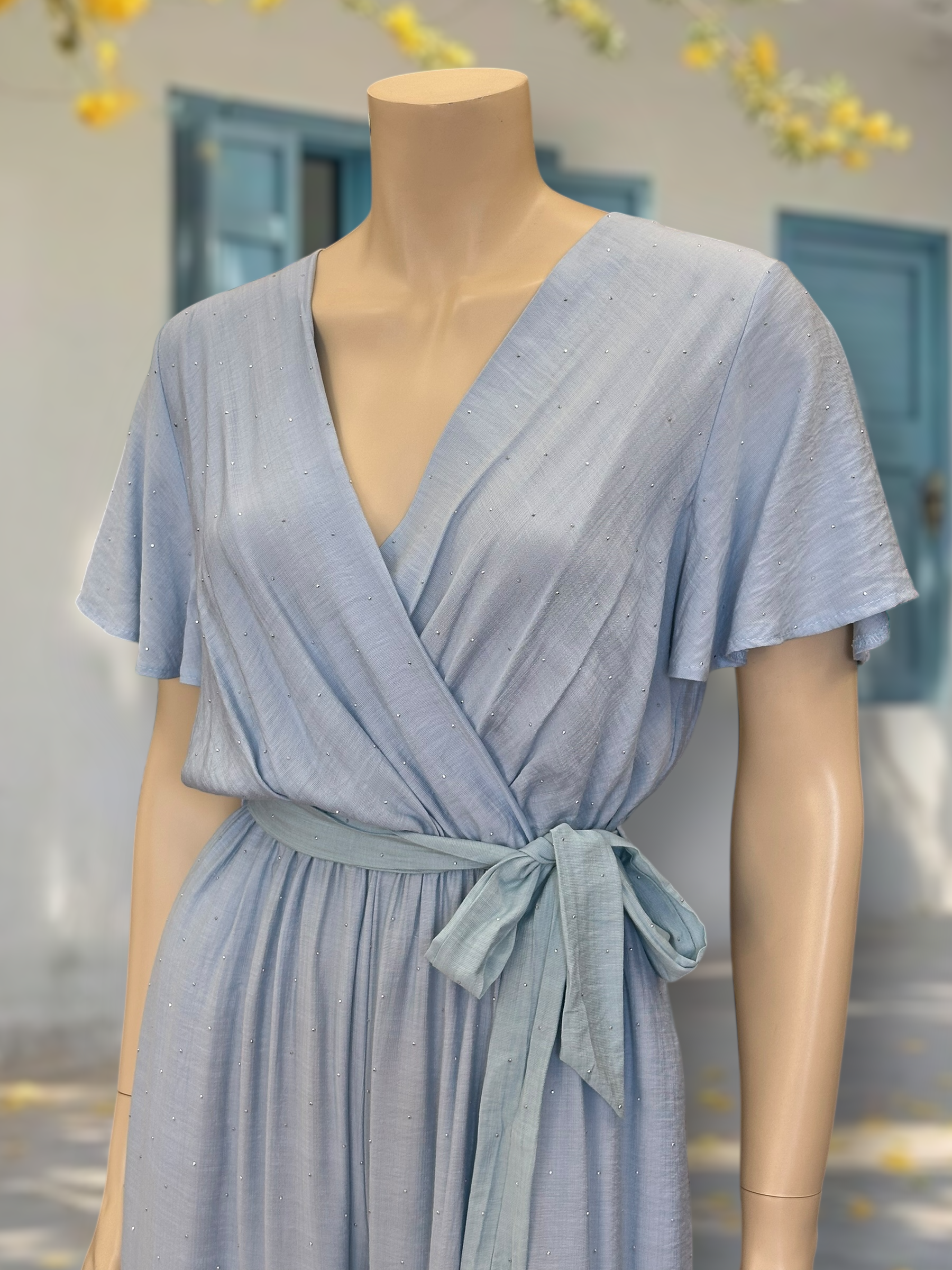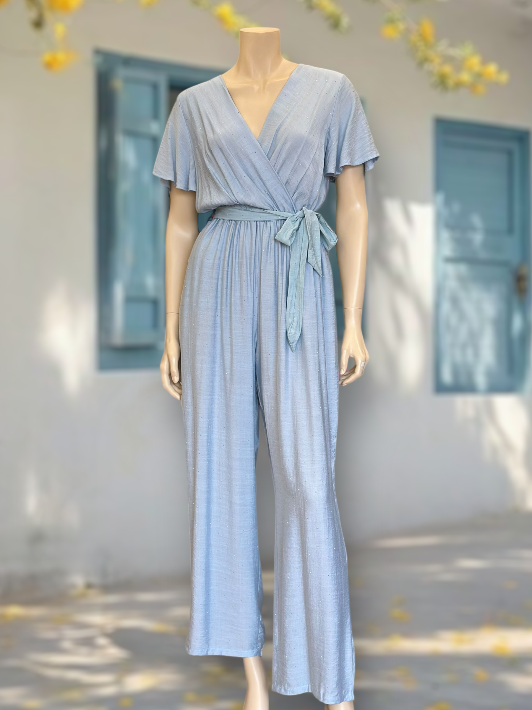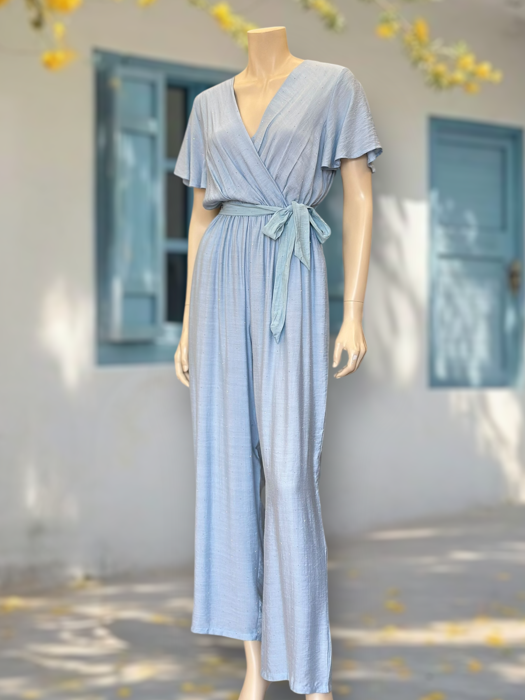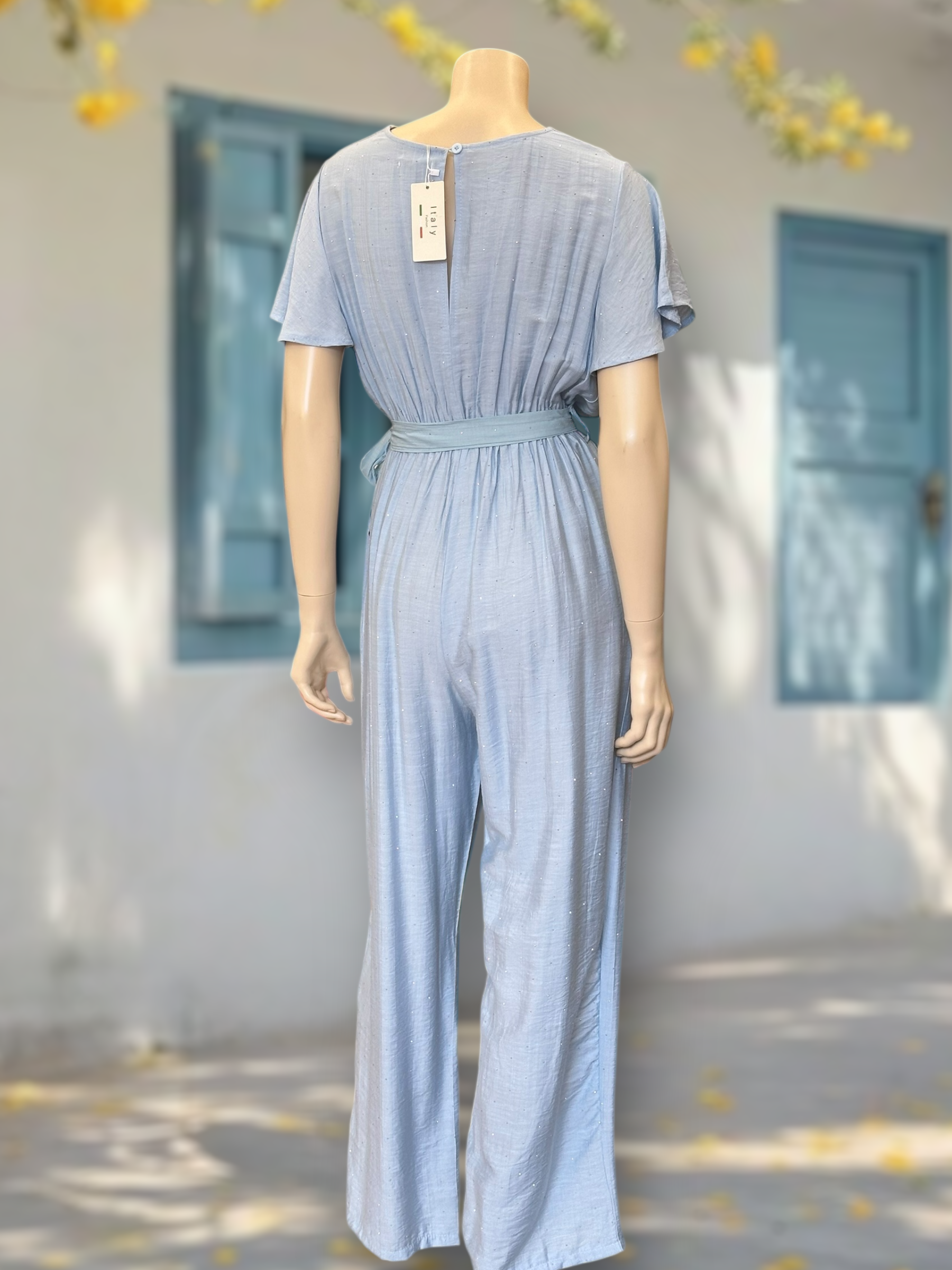 Un enterito liviano, cómodo y lleno de luz. Su tela con sutiles destellos le da un acabado delicado y femenino, perfecto para días cálidos, eventos o un look veraniego sofisticado.