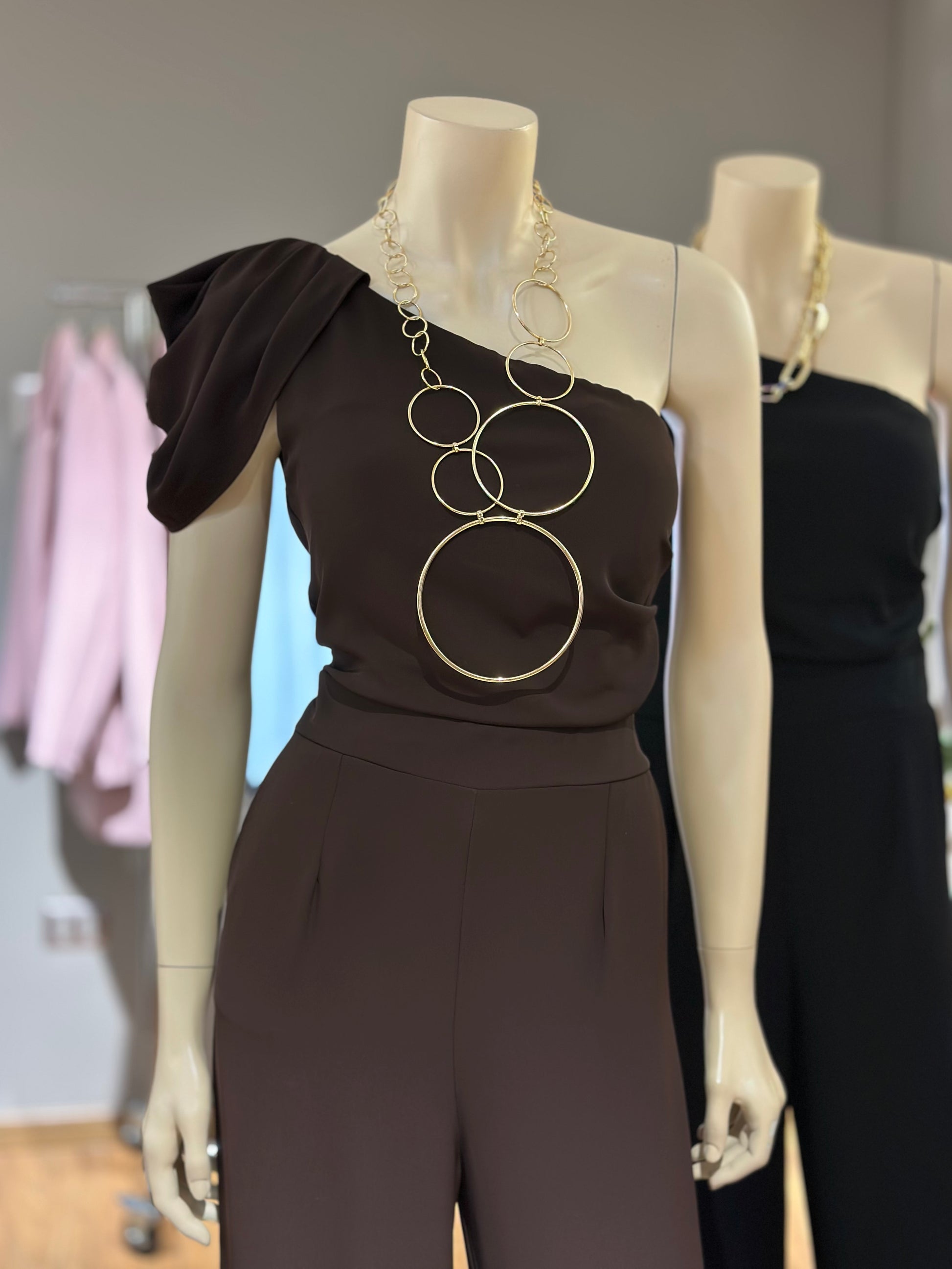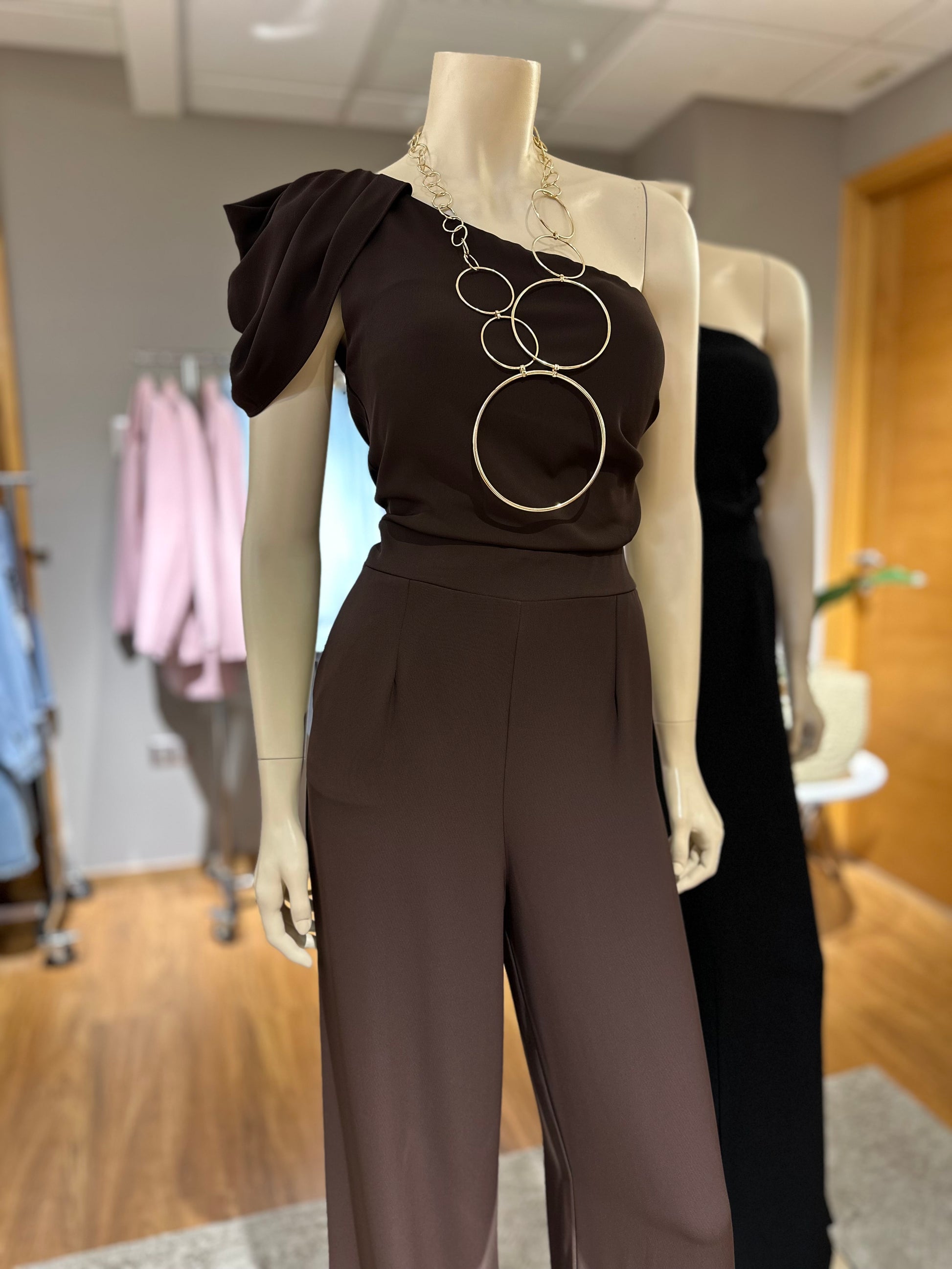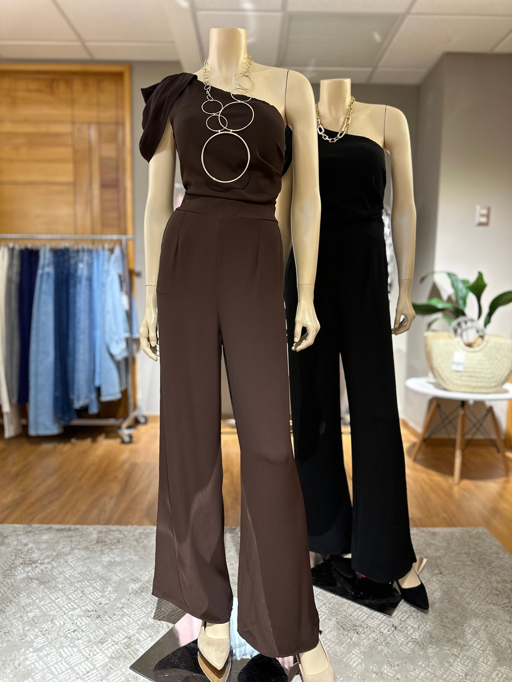 Un diseño sofisticado que combina elegancia y comodidad. Con corte asimétrico de un hombro y pierna ancha, este enterito es ideal para matrimonios, cenas y celebraciones donde quieras destacar con un look refinado y moderno.