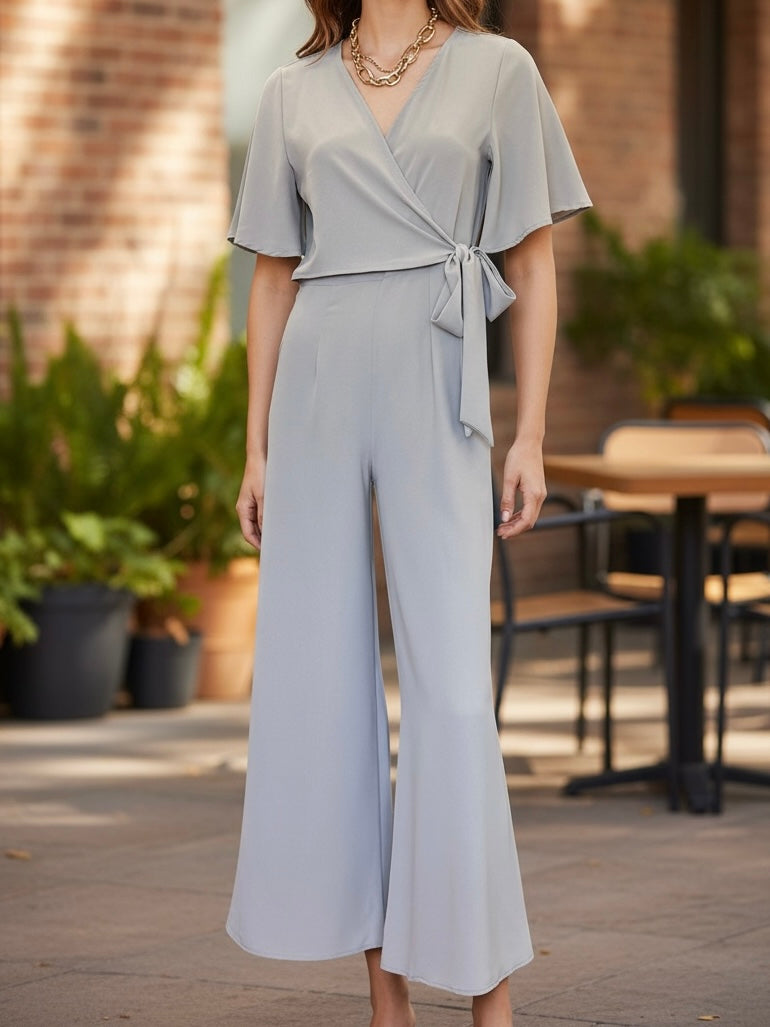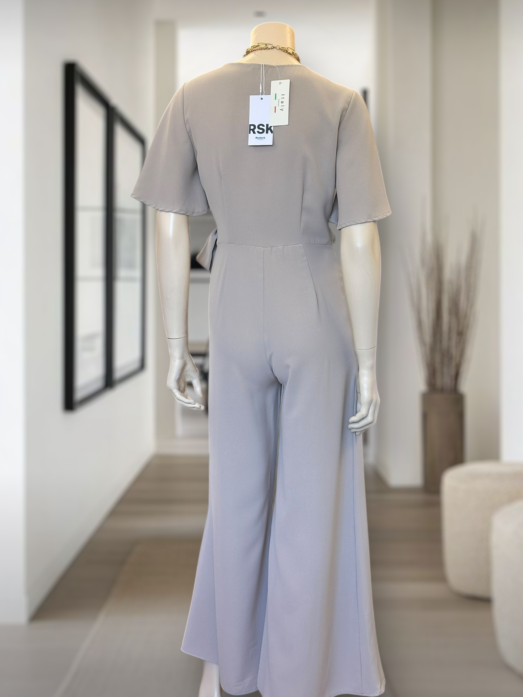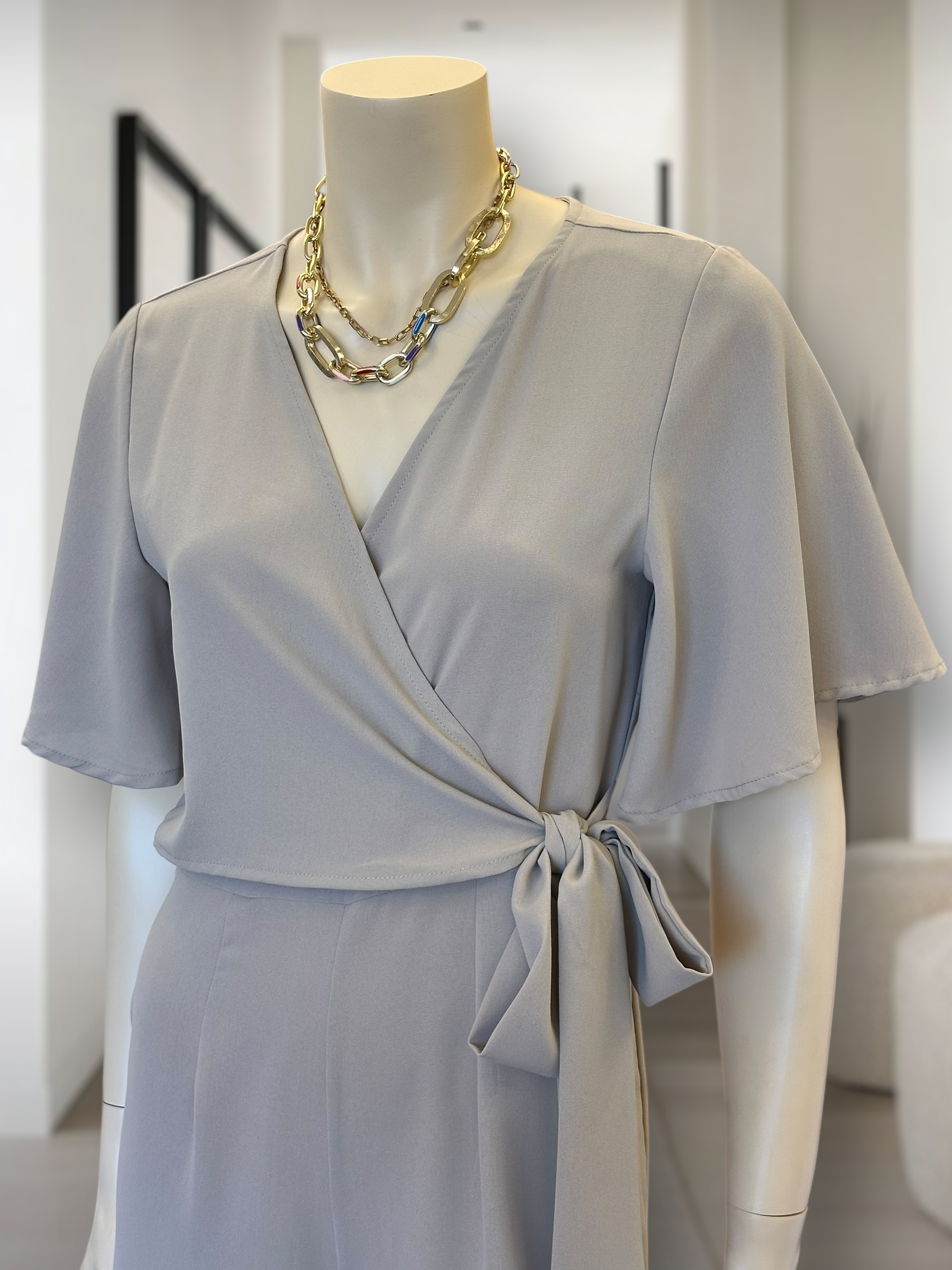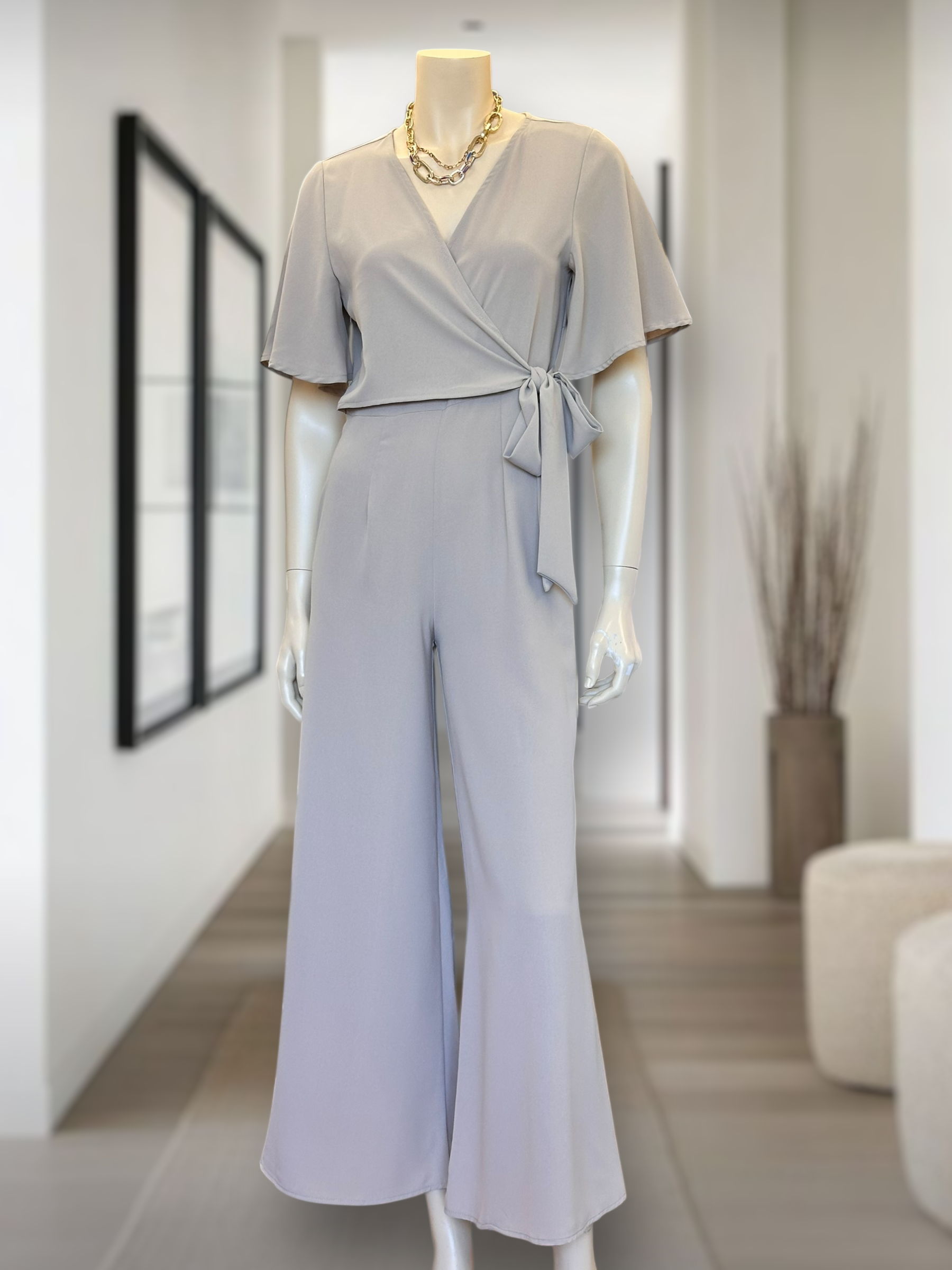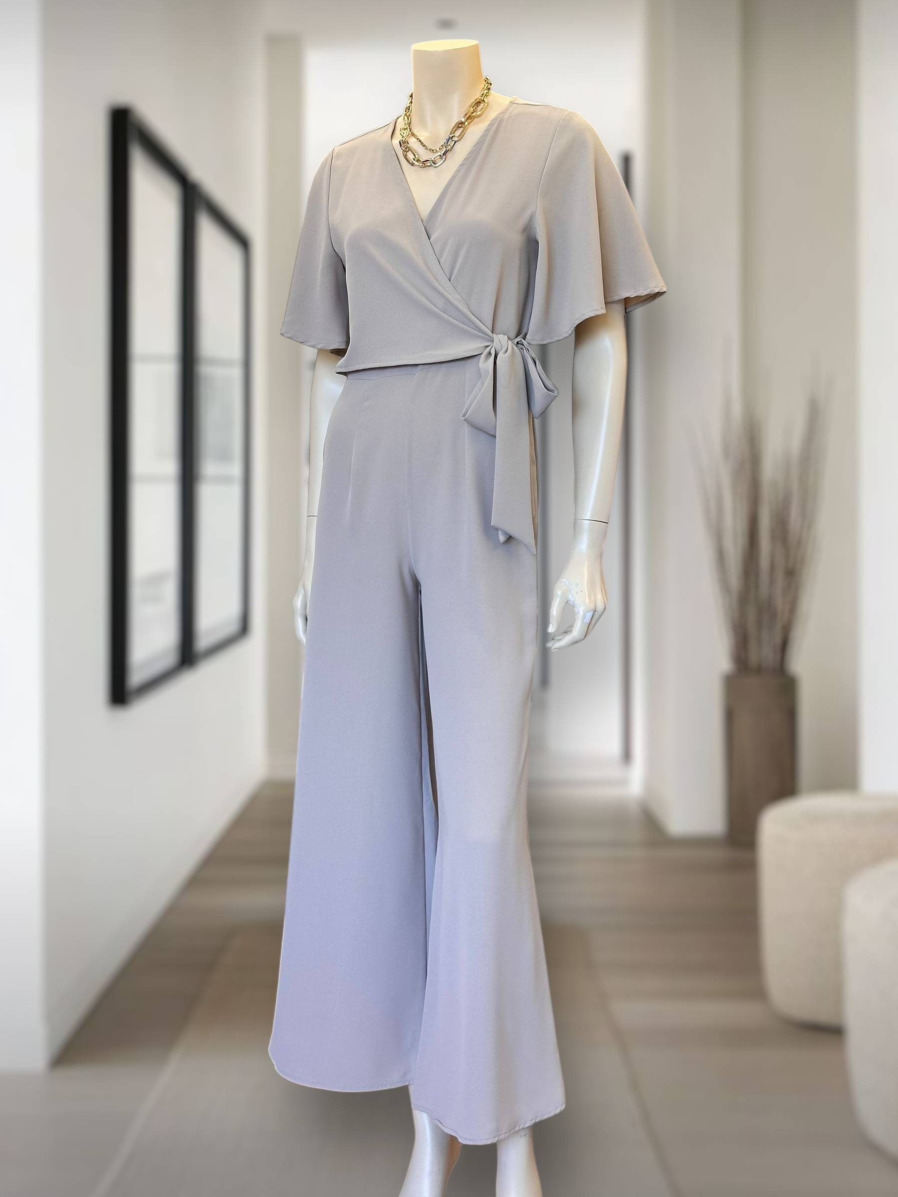 Un enterito elegante y de caída fluida, perfecto para eventos, celebraciones o para lucir un look sofisticado sin esfuerzo. Su diseño cruzado estiliza la parte superior, mientras que las mangas amplias y el lazo lateral aportan movimiento y comodidad. Incluye cierre lateral invisible, lo que permite un calce más limpio y favorecedor.