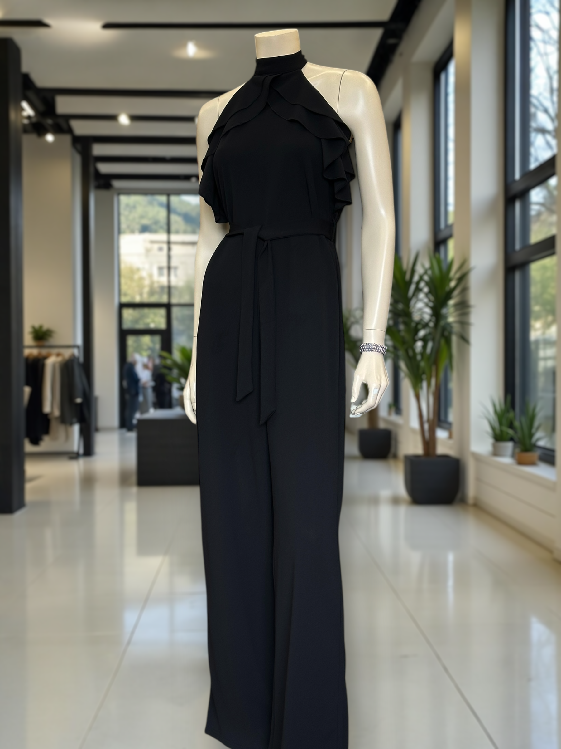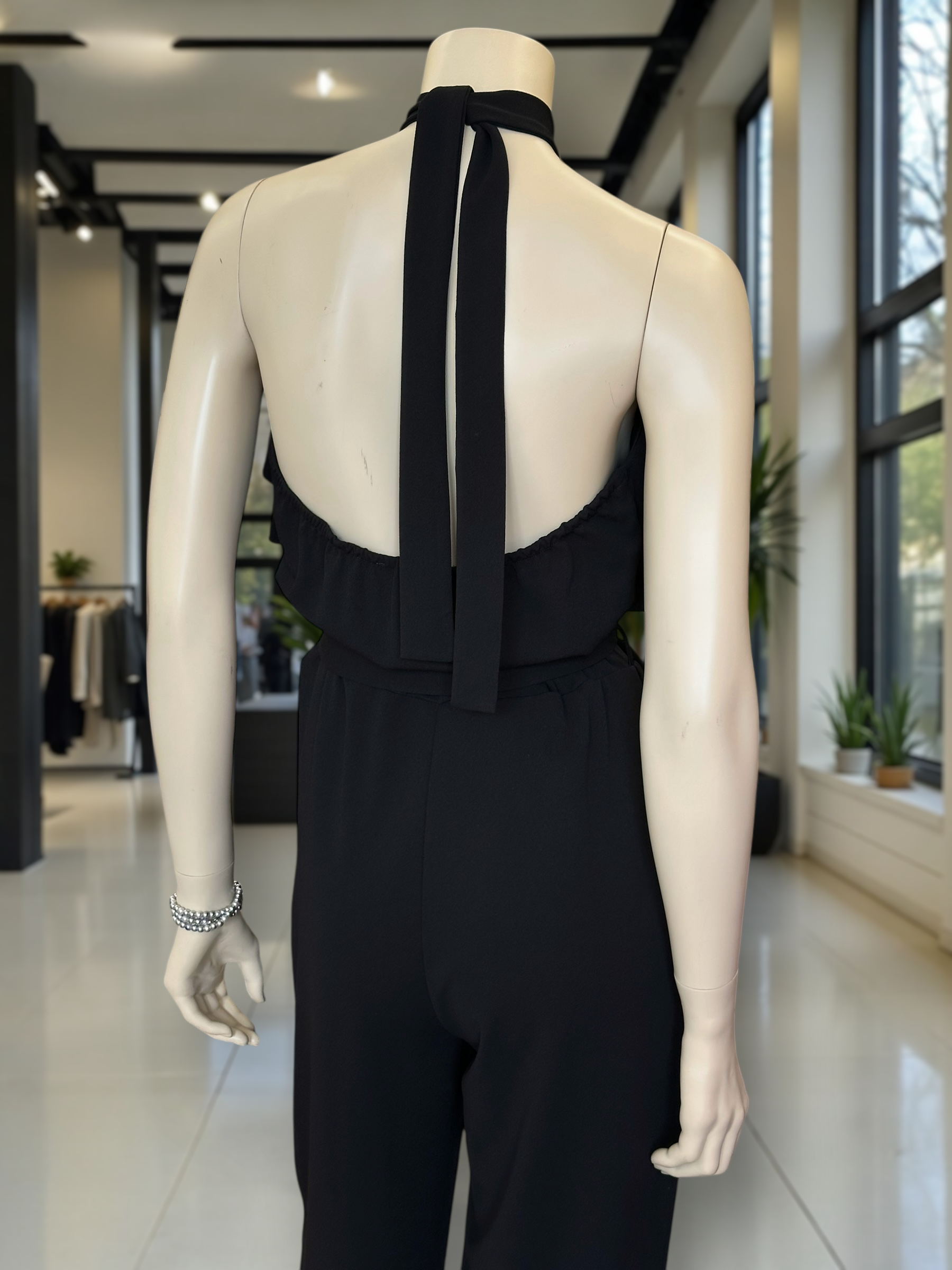 Nuestro enterito de sueño italiano destaca por su cuello halter con volantes, espalda descubierta y lazo regulable que estiliza la cintura. Ideal para eventos, celebraciones y noches especiales.
