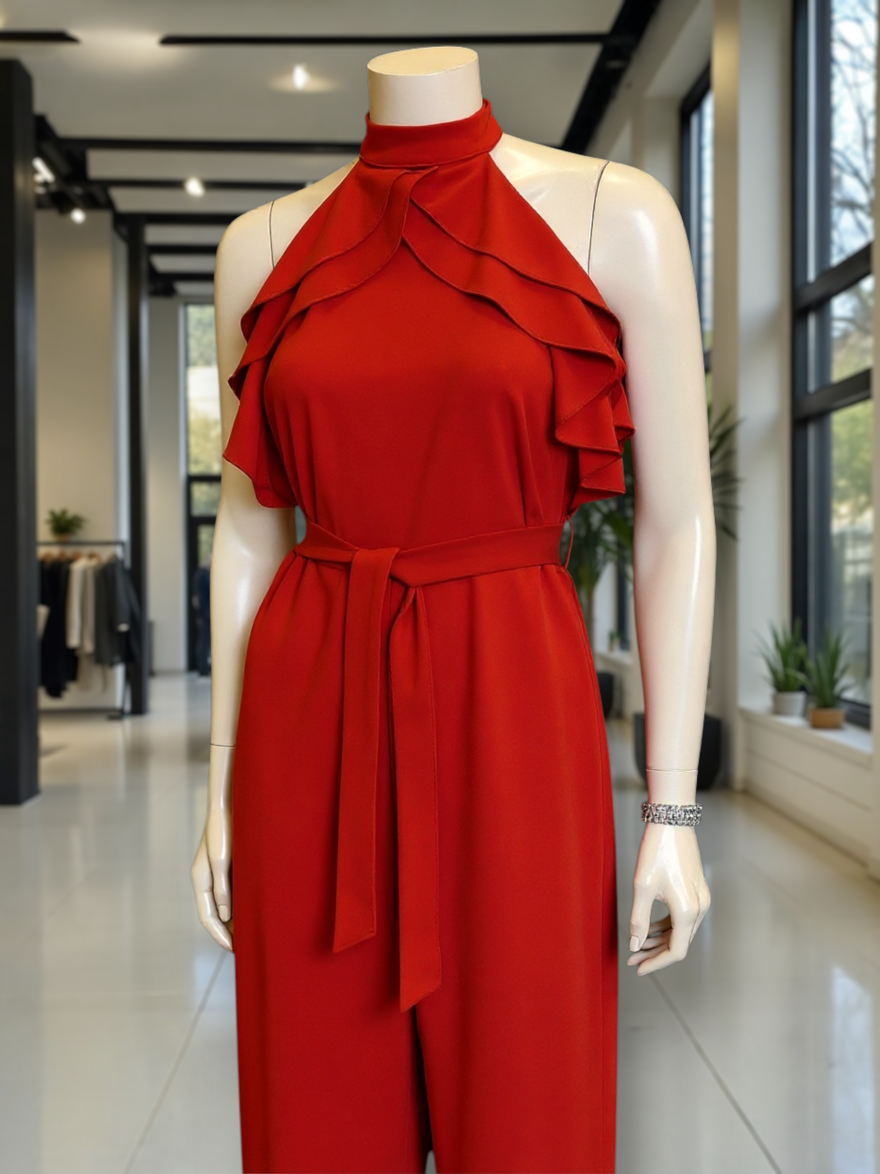 Nuestro enterito de sueño italiano destaca por su cuello halter con volantes, espalda descubierta y lazo regulable que estiliza la cintura. Ideal para eventos, celebraciones y noches especiales.