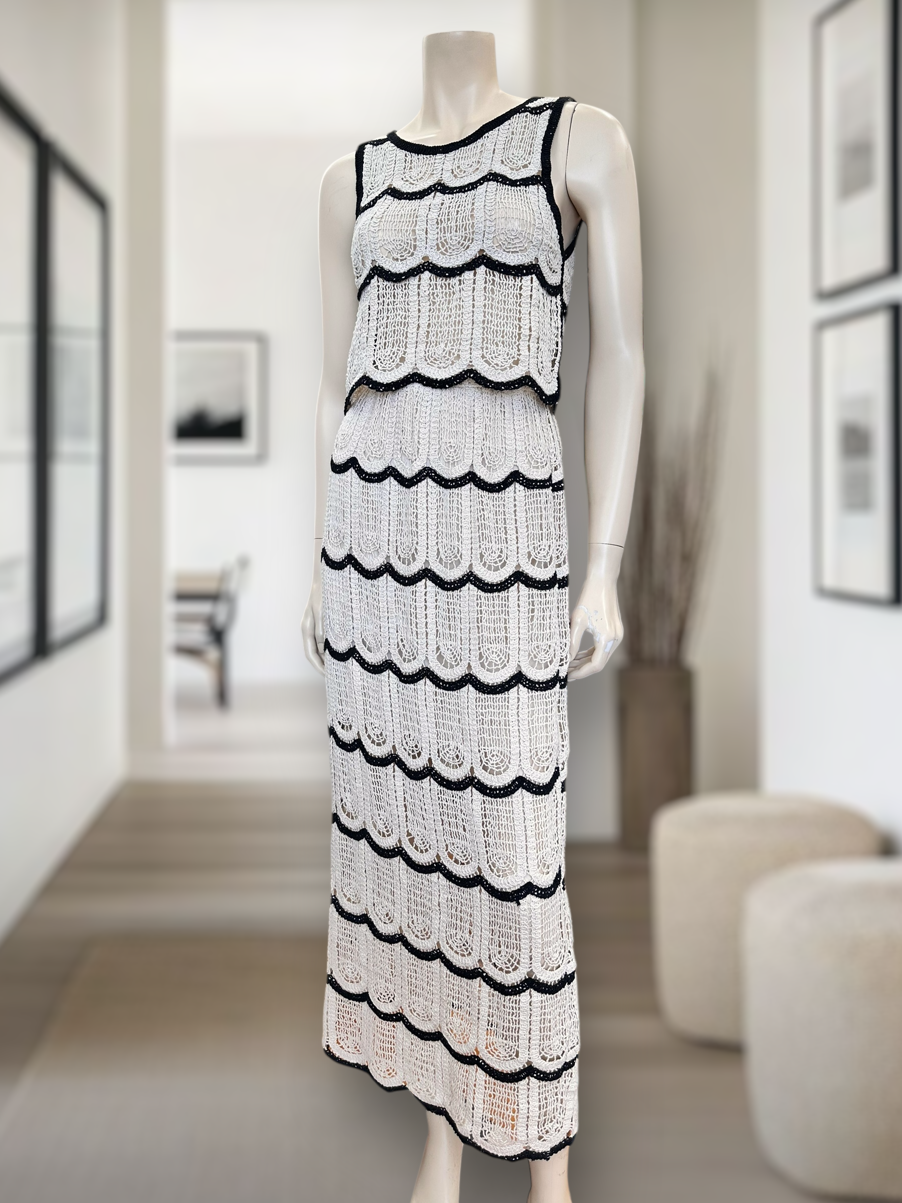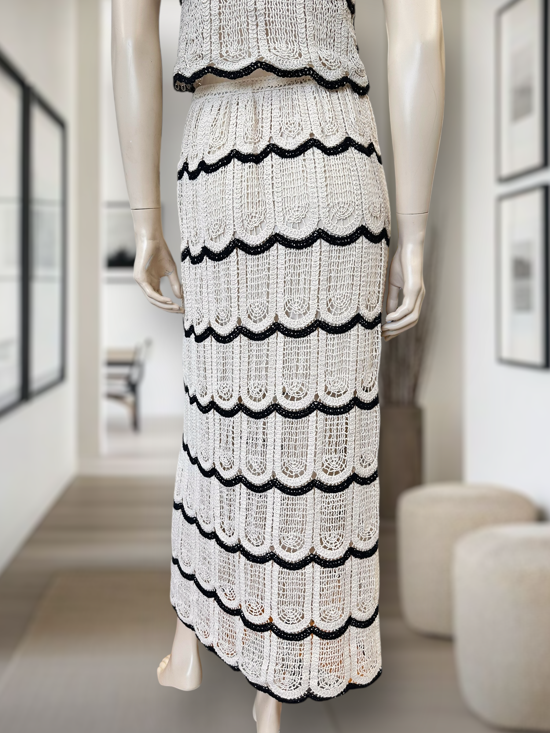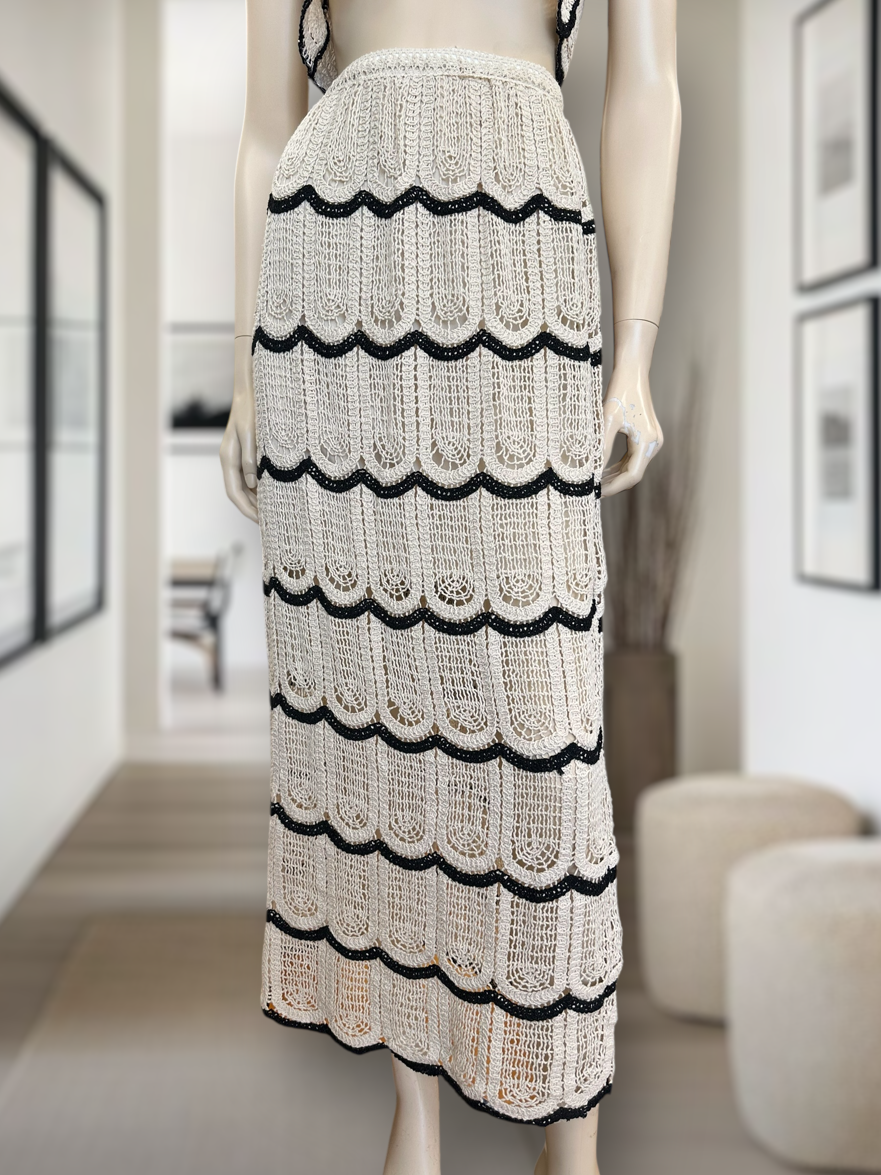 Dale un toque elegante y veraniego a tus looks con esta falda estilo crochet, diseño exclusivo con ondas en relieve y contrastes en negro. Versátil, fresca y perfecta para combinar con su top a juego o con prendas básicas.