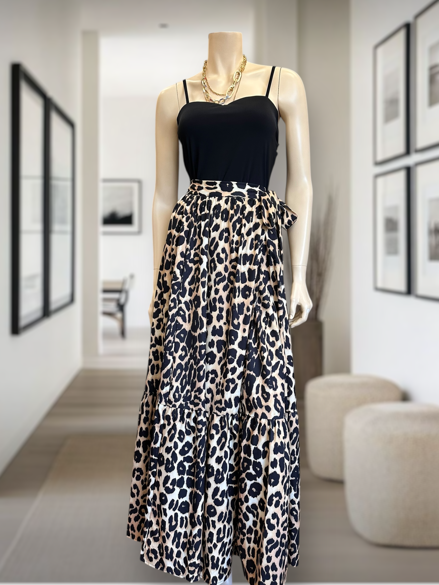 Falda envolvente con cintura ajustable, favorecedora y cómoda. Su estampado leopardo la convierte en una prenda versátil, ideal para combinar con blusas, tops o chaquetas.