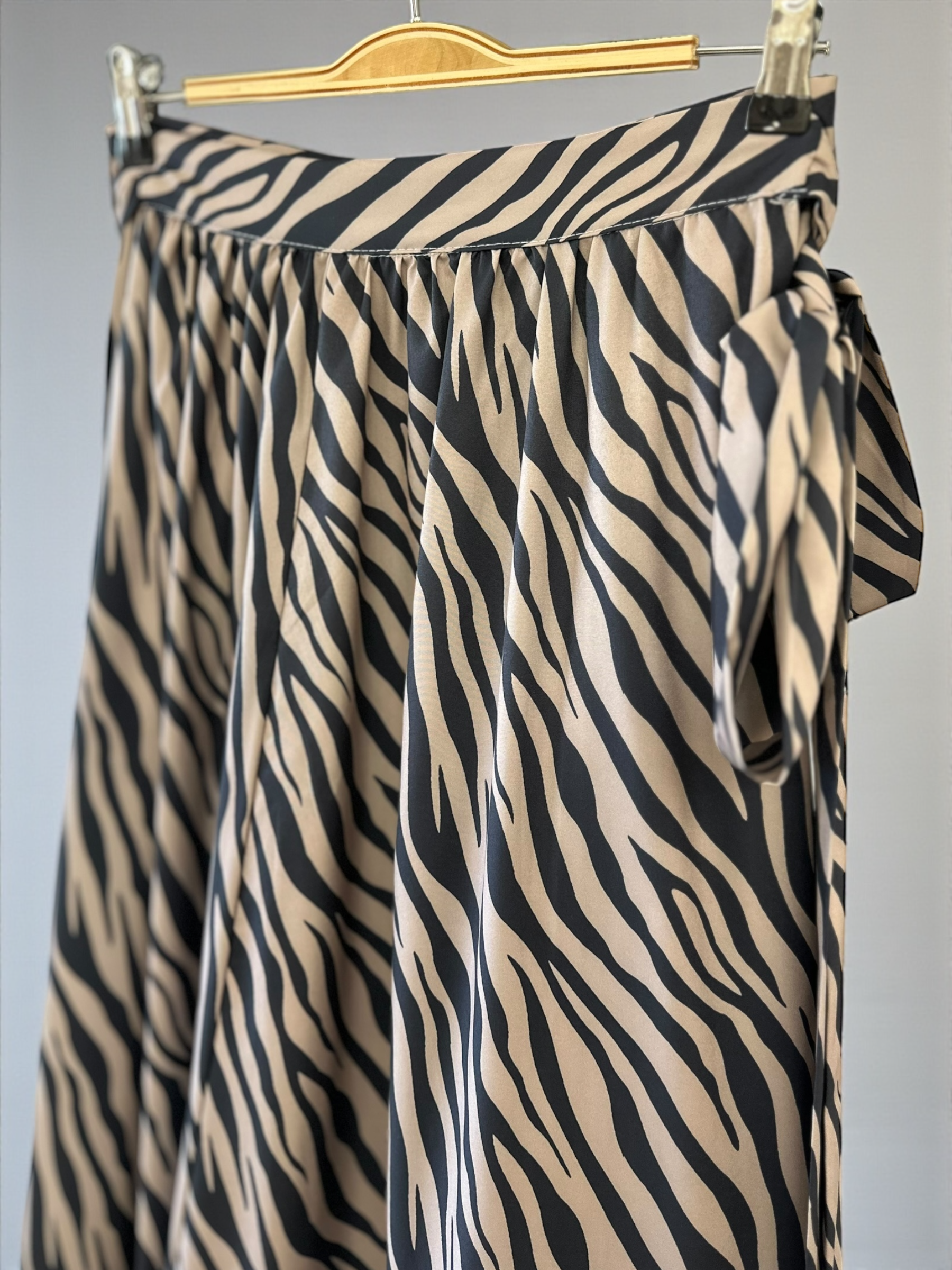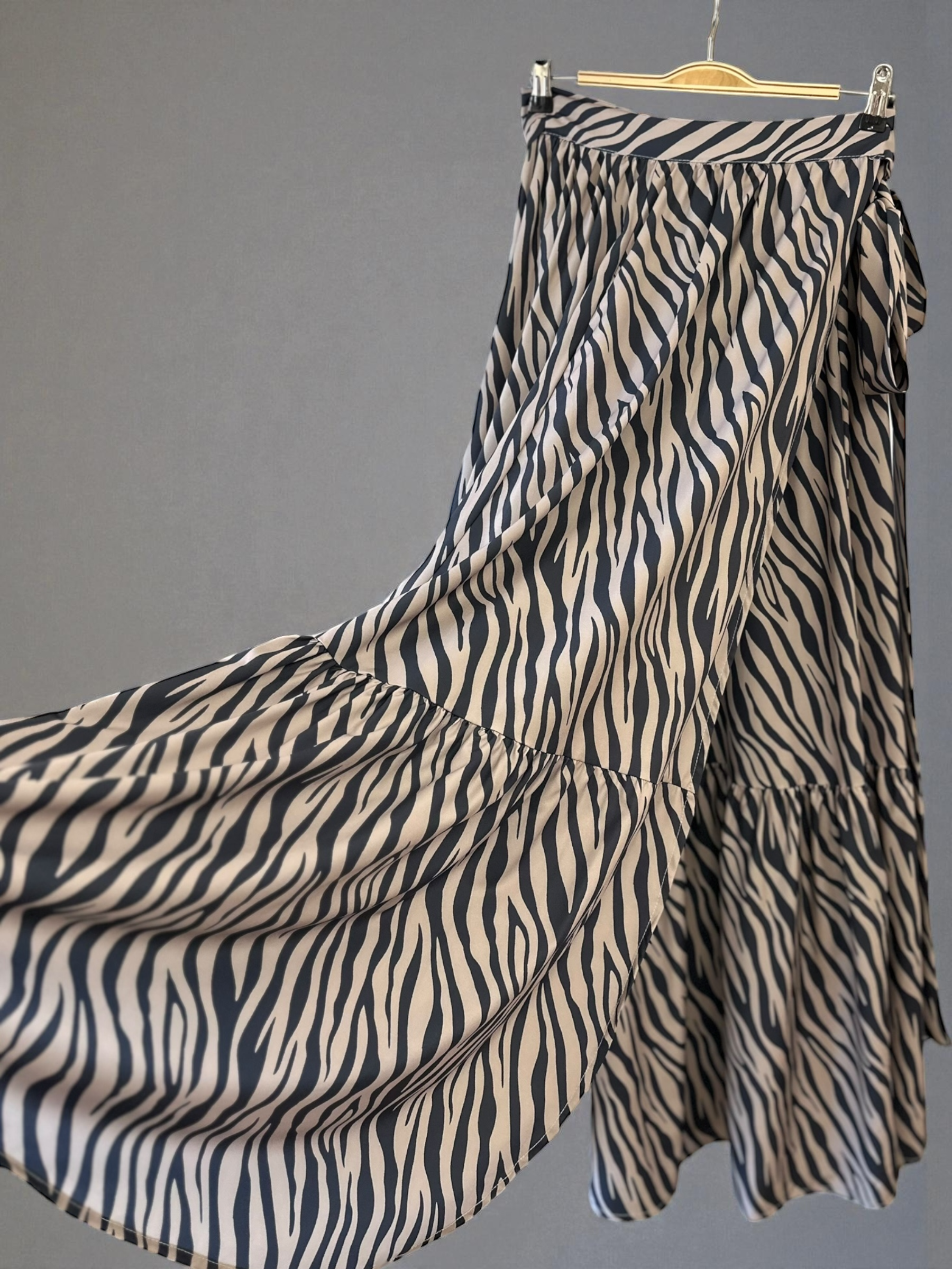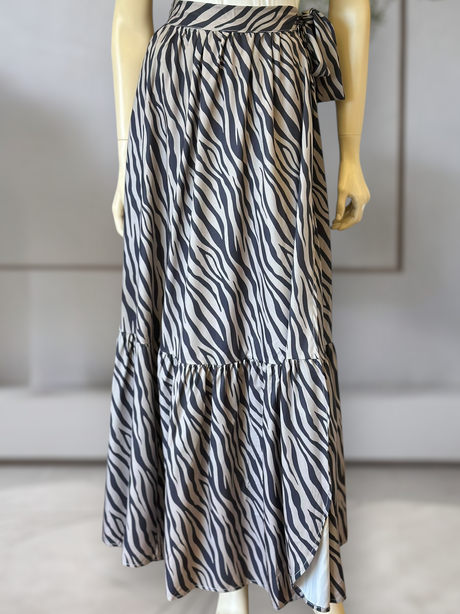 Falda envolvente con cintura ajustable, favorecedora y cómoda. Su estampado colorido de cebra la convierte en una prenda versátil, ideal para combinar con blusas, tops o chaquetas.