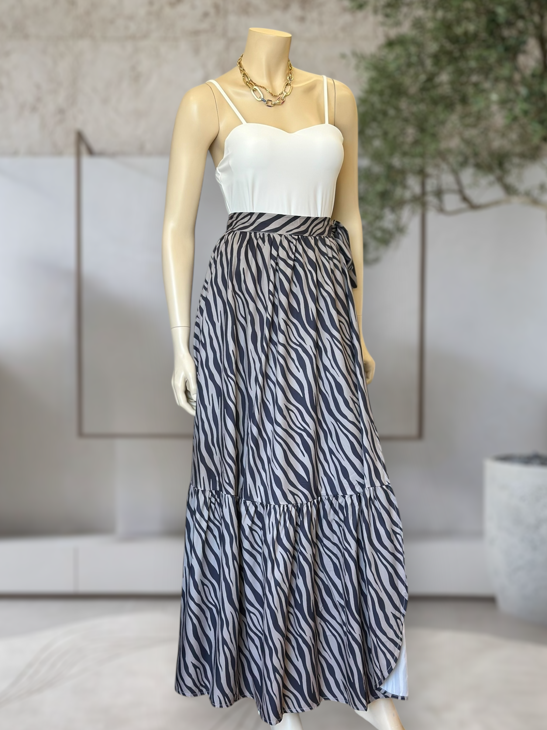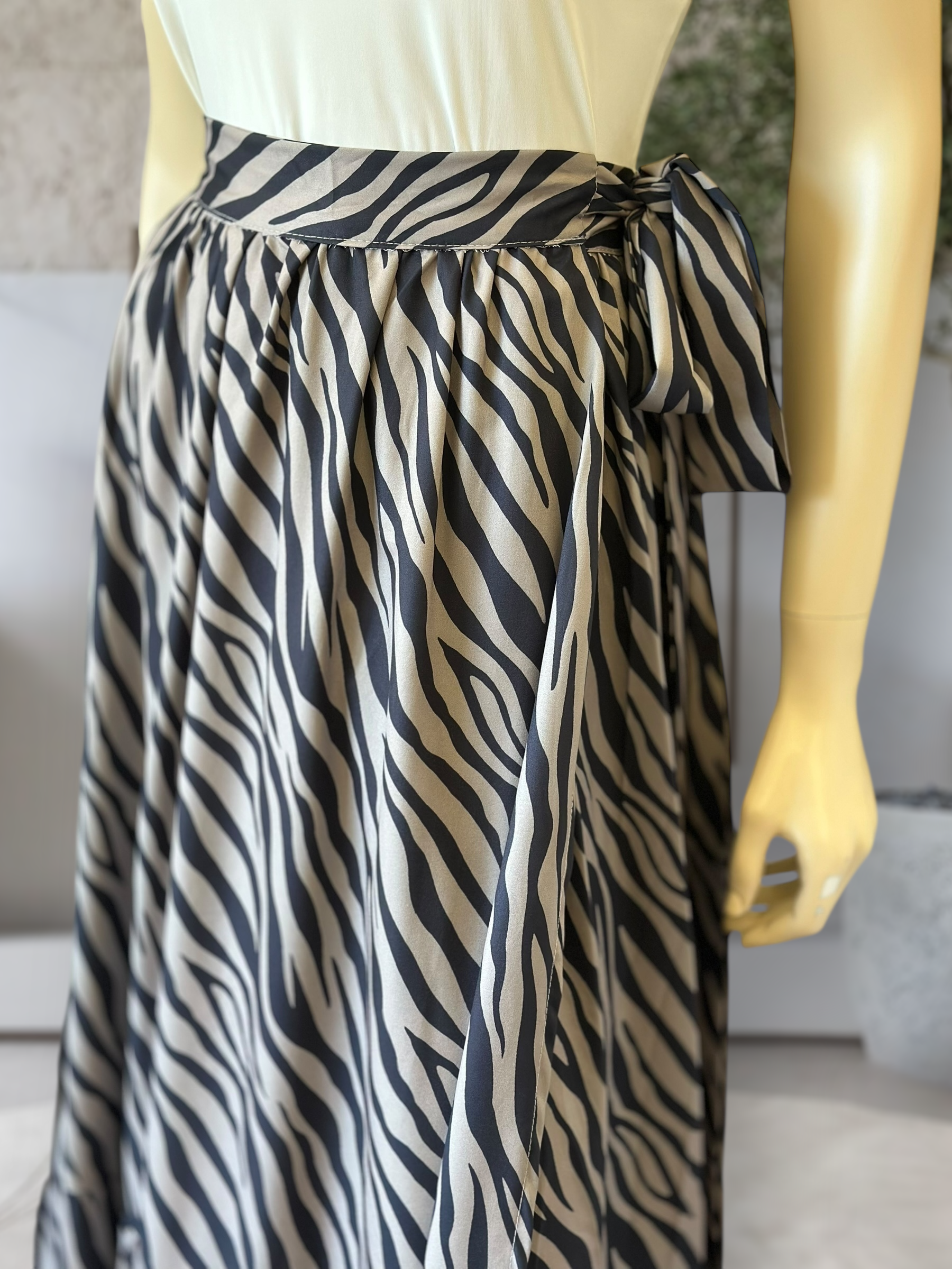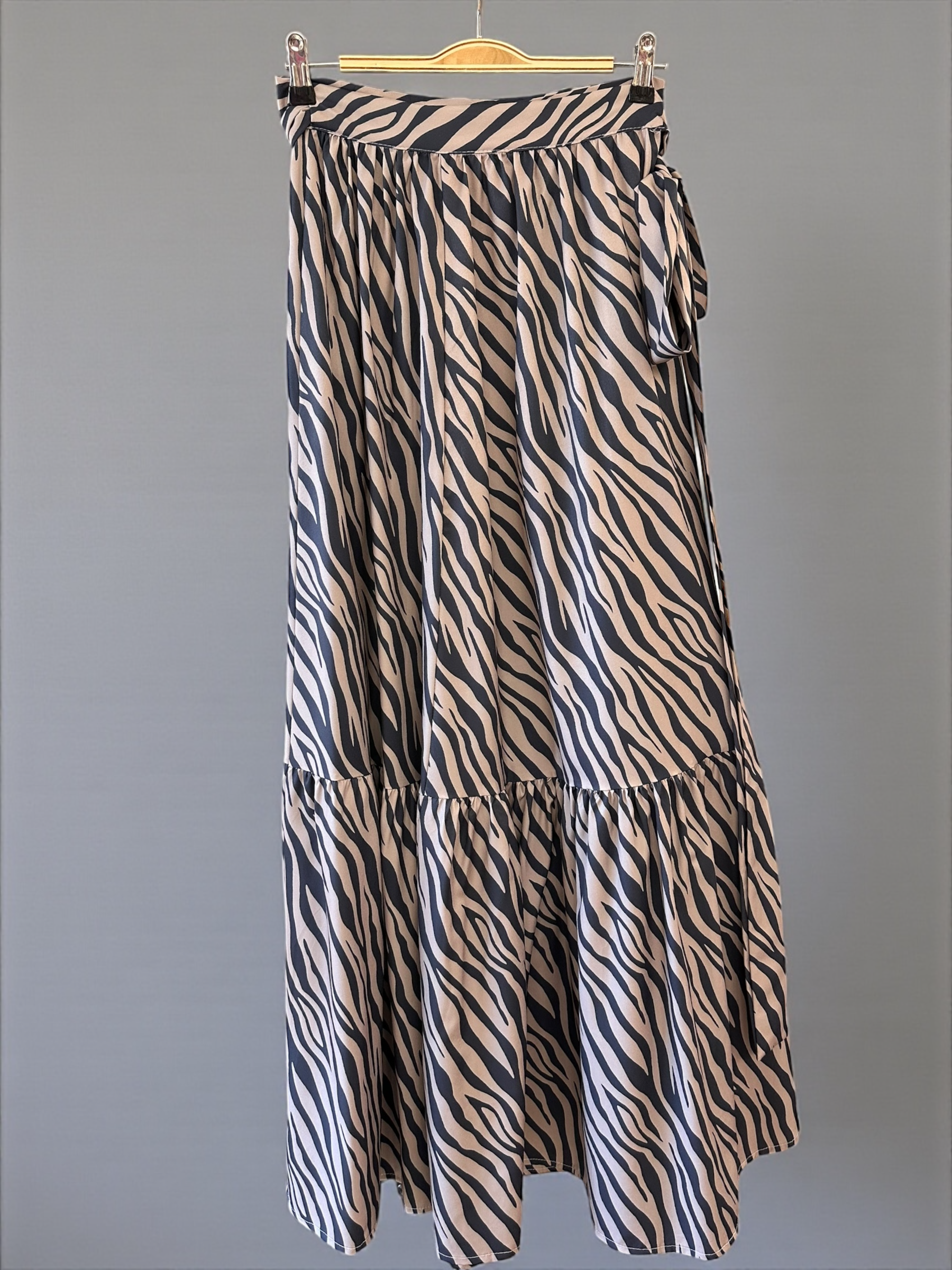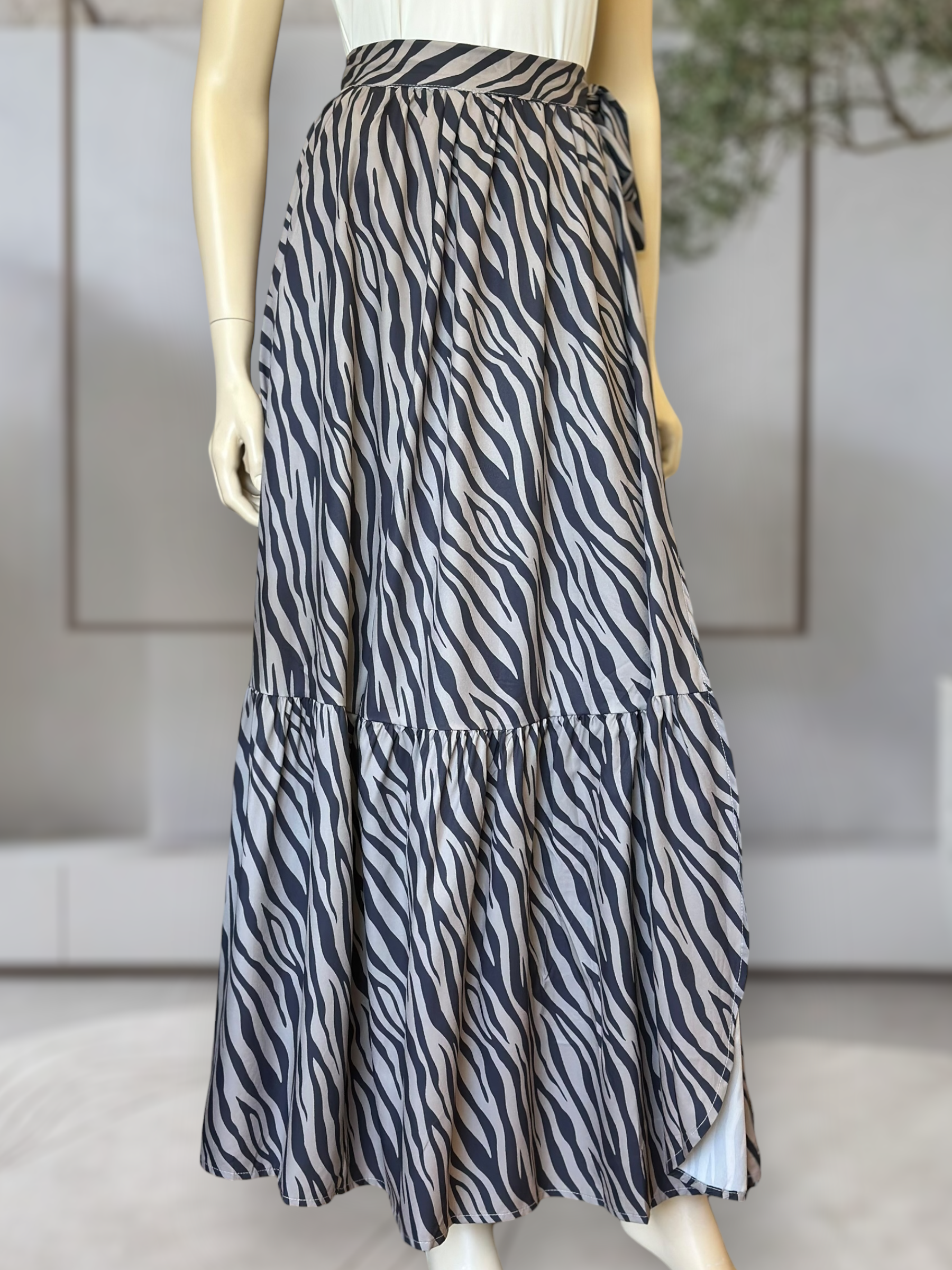 Falda envolvente con cintura ajustable, favorecedora y cómoda. Su estampado colorido de cebra la convierte en una prenda versátil, ideal para combinar con blusas, tops o chaquetas.