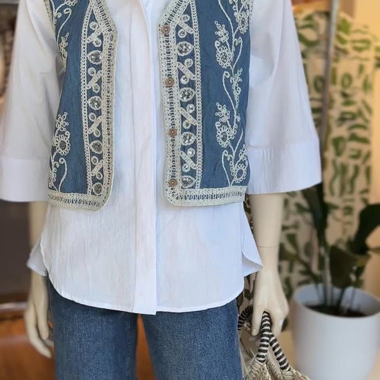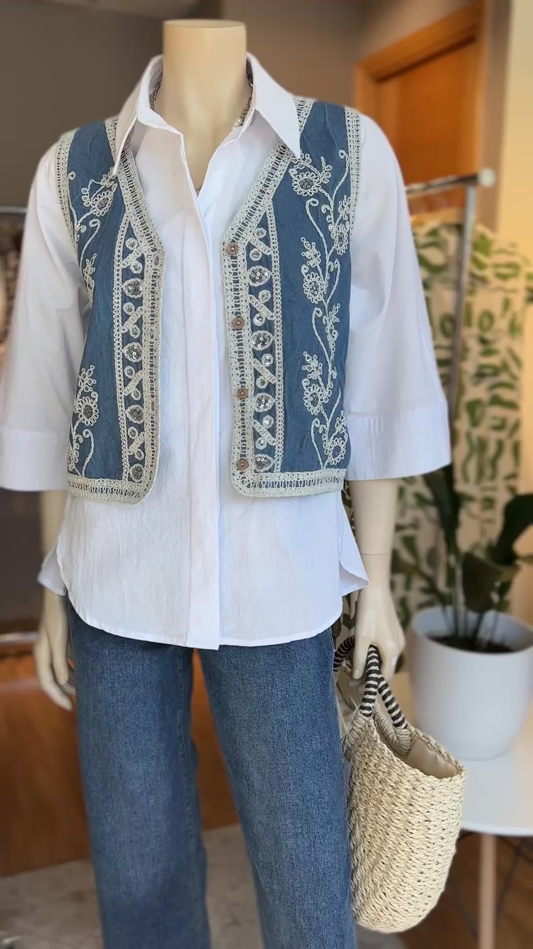 Un diseño único que mezcla la frescura del denim con delicados detalles bordados en hilo blanco. Este chaleco sin mangas es perfecto para dar un aire bohemio y femenino a cualquier look. Diseñado en Italia.