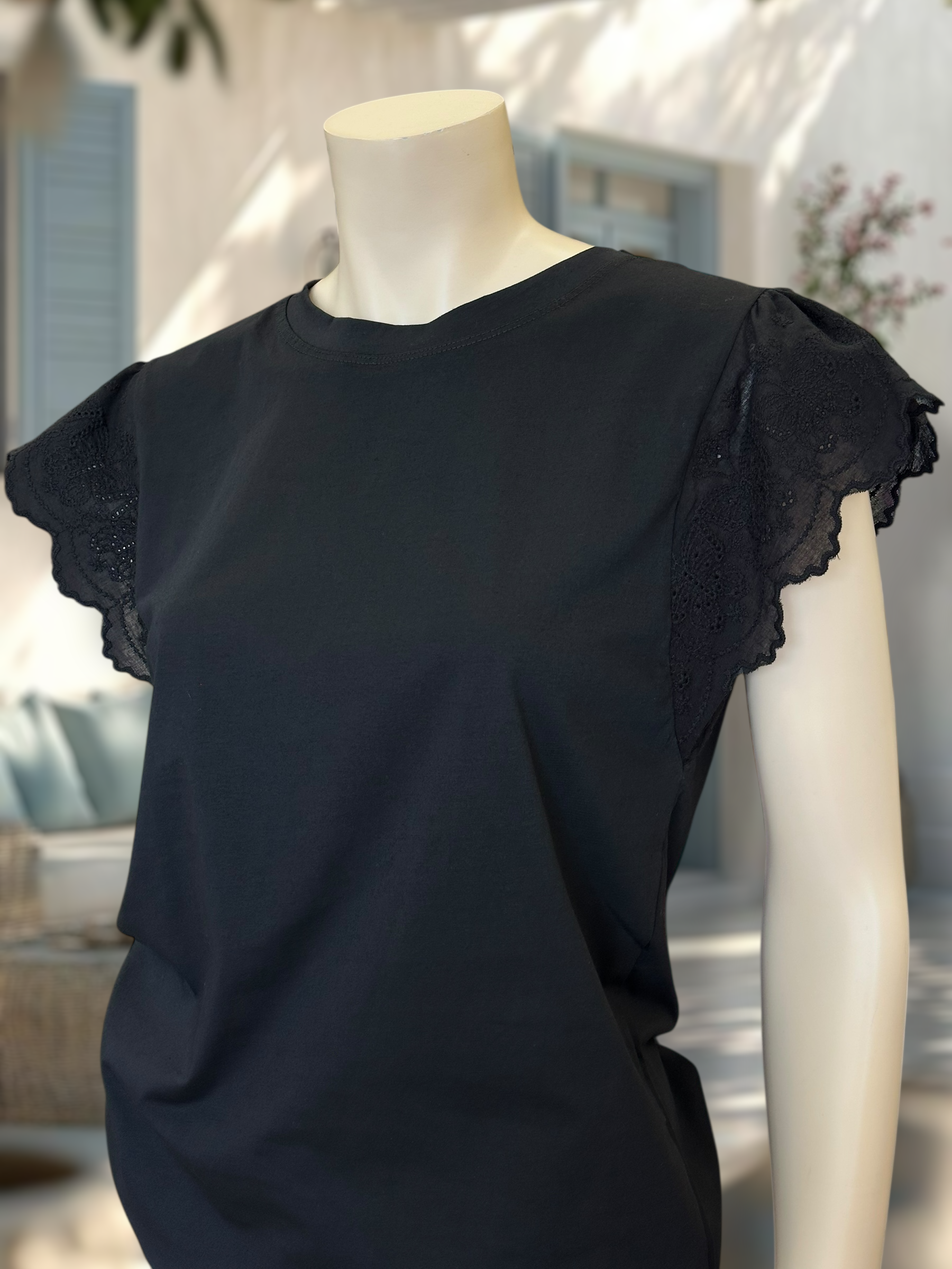 Polera femenina y delicada, confeccionada en algodón spandex para un calce suave, cómodo y ligeramente elasticado. Su detalle de mangas bordadas tipo volado aporta un toque romántico y estiloso, ideal para elevar cualquier look casual.