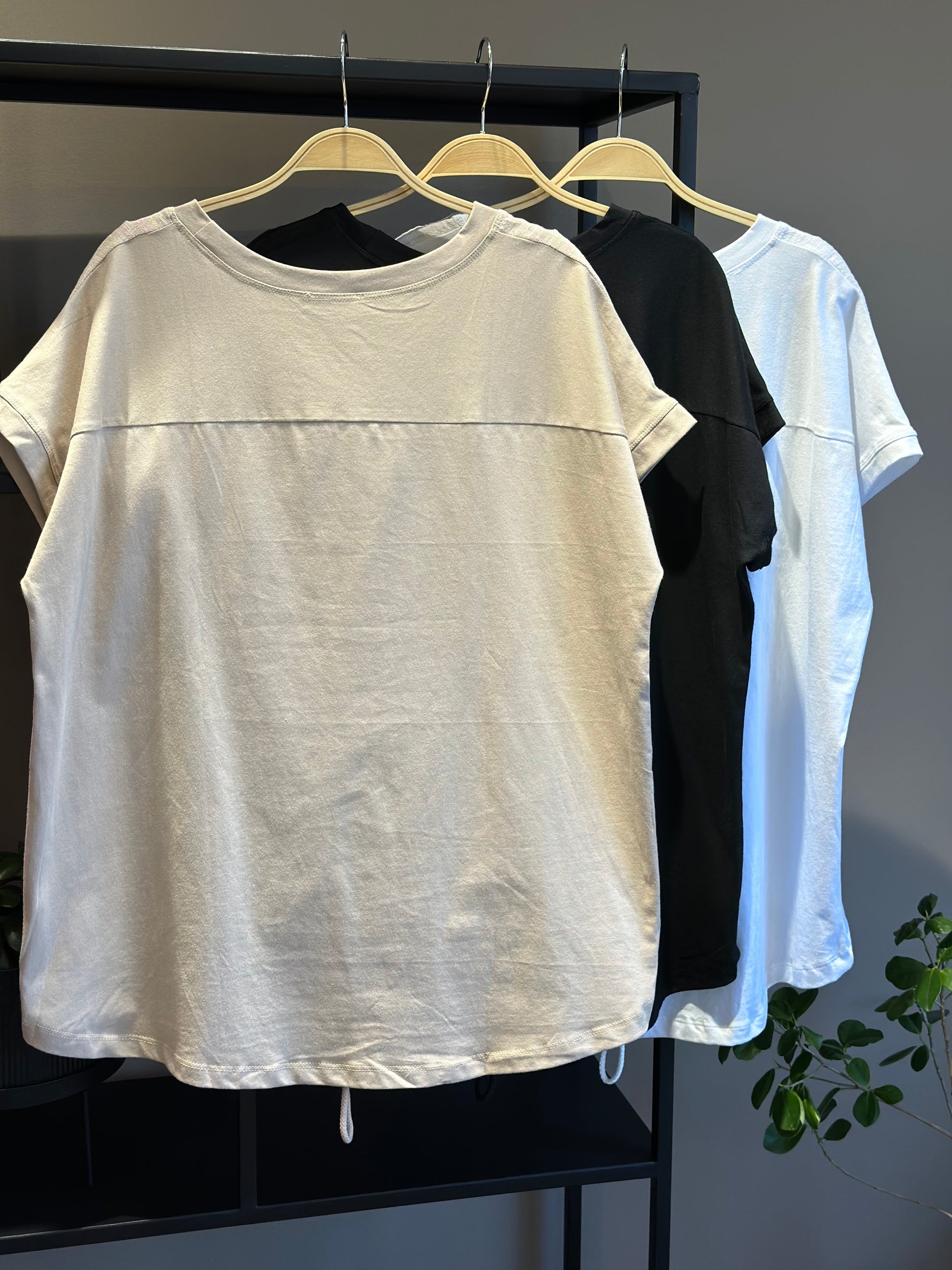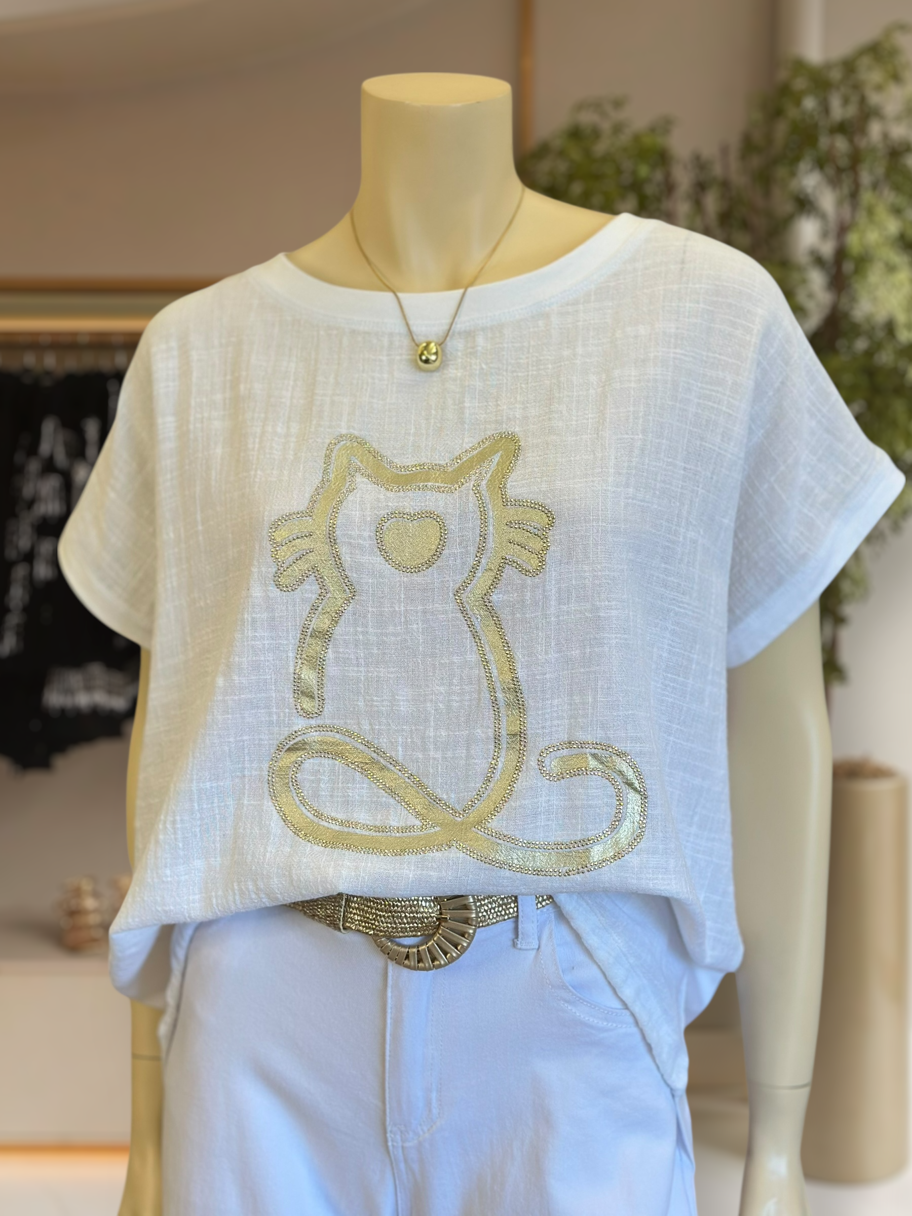 Polera con frente de lino y espalda de algodón, que combina textura y suavidad. Su estampado de gato aporta un toque original y divertido, ideal para looks casuales con estilo natural.