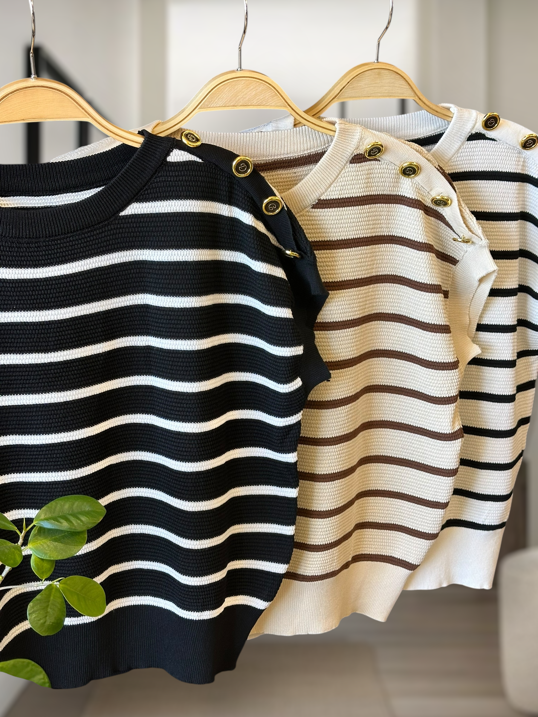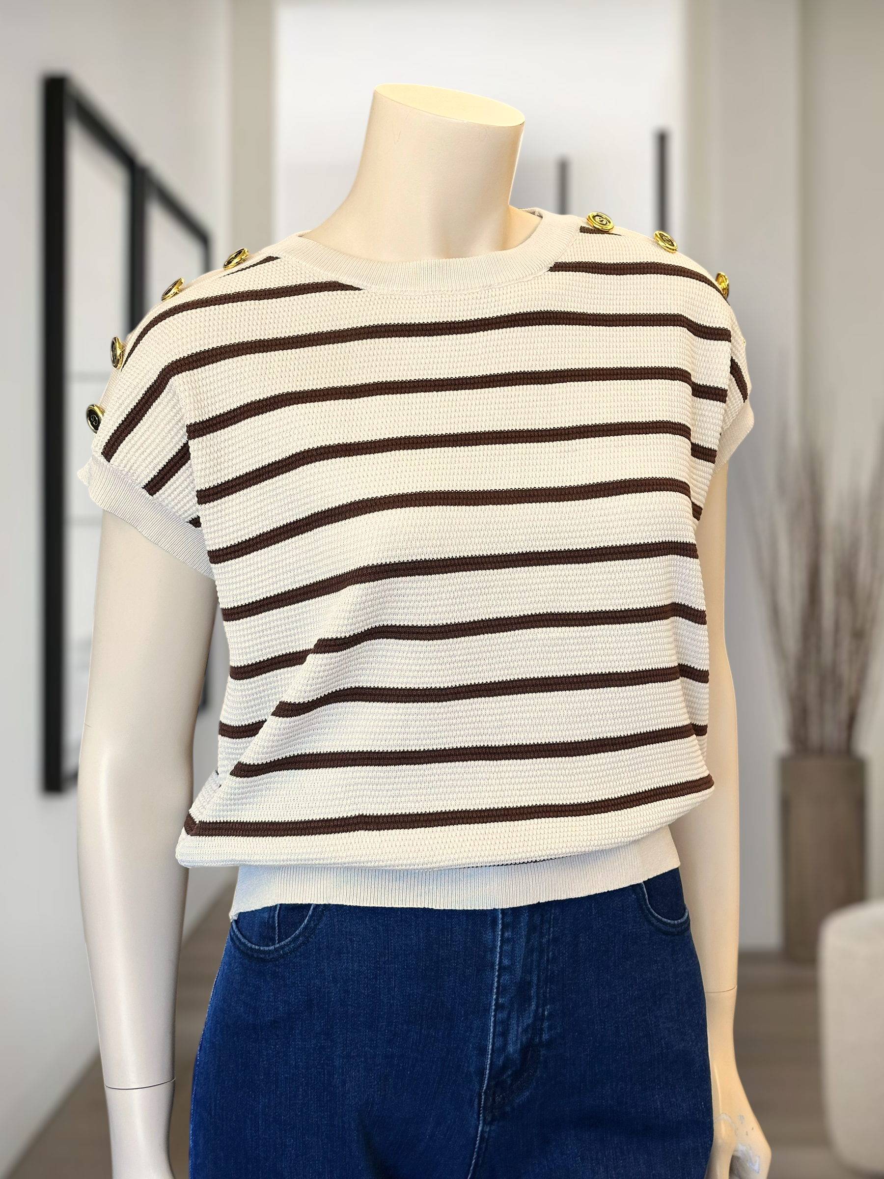 Polera de hilo elasticado con diseño a rayas y detalle de botones dorados en los hombros. Su calce es cómodo, fresco y ligeramente stretch, ideal para looks casuales con un toque chic.
