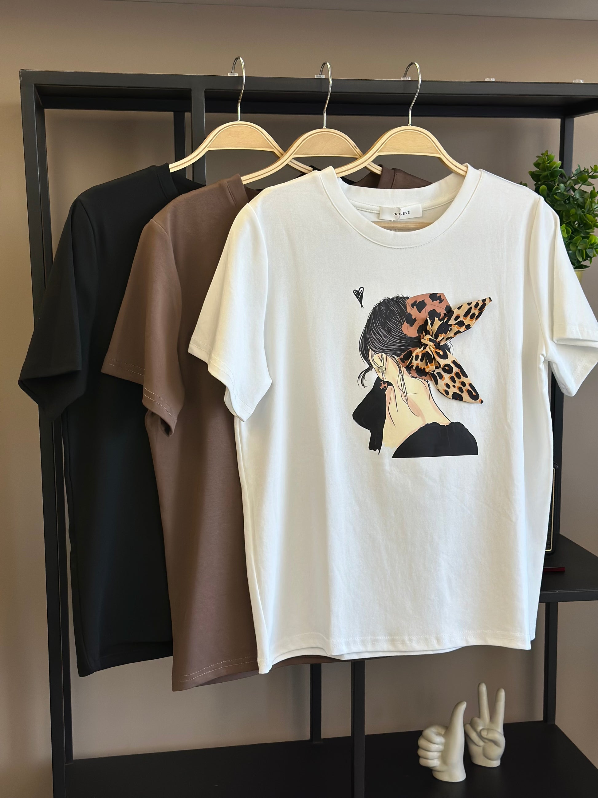 Polera de algodón spandex con diseño ilustrado y detalle aplicado de lazo estampado en animal print, que le da un toque único y femenino. Suave, cómoda y perfecta para looks casuales con estilo.