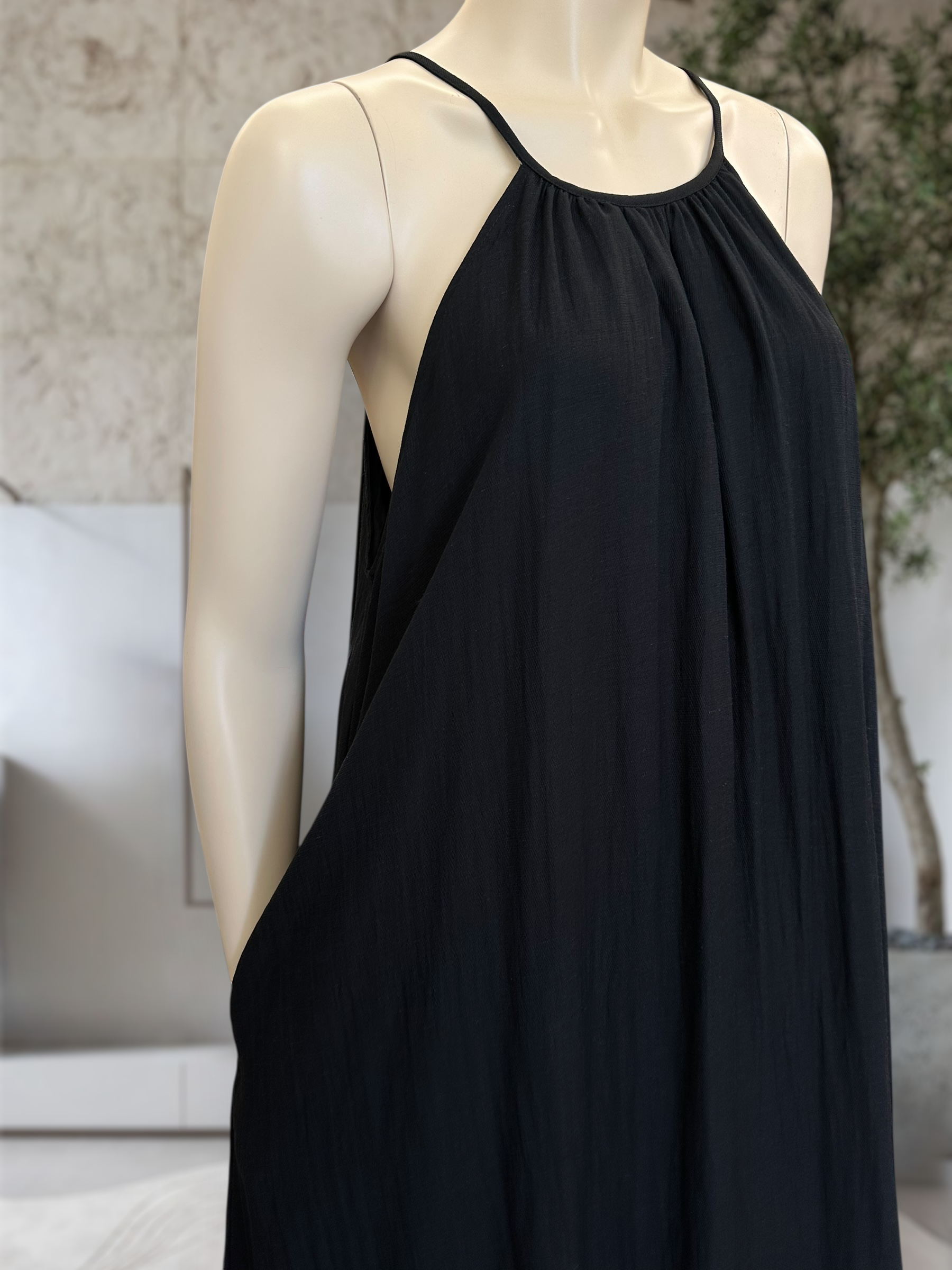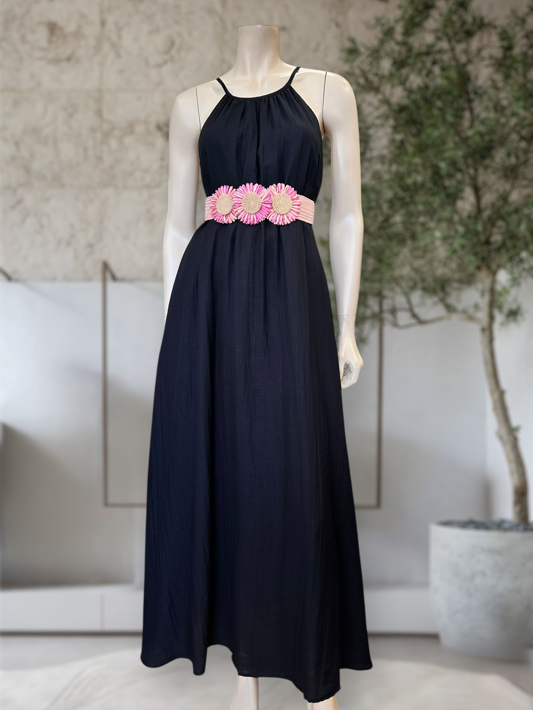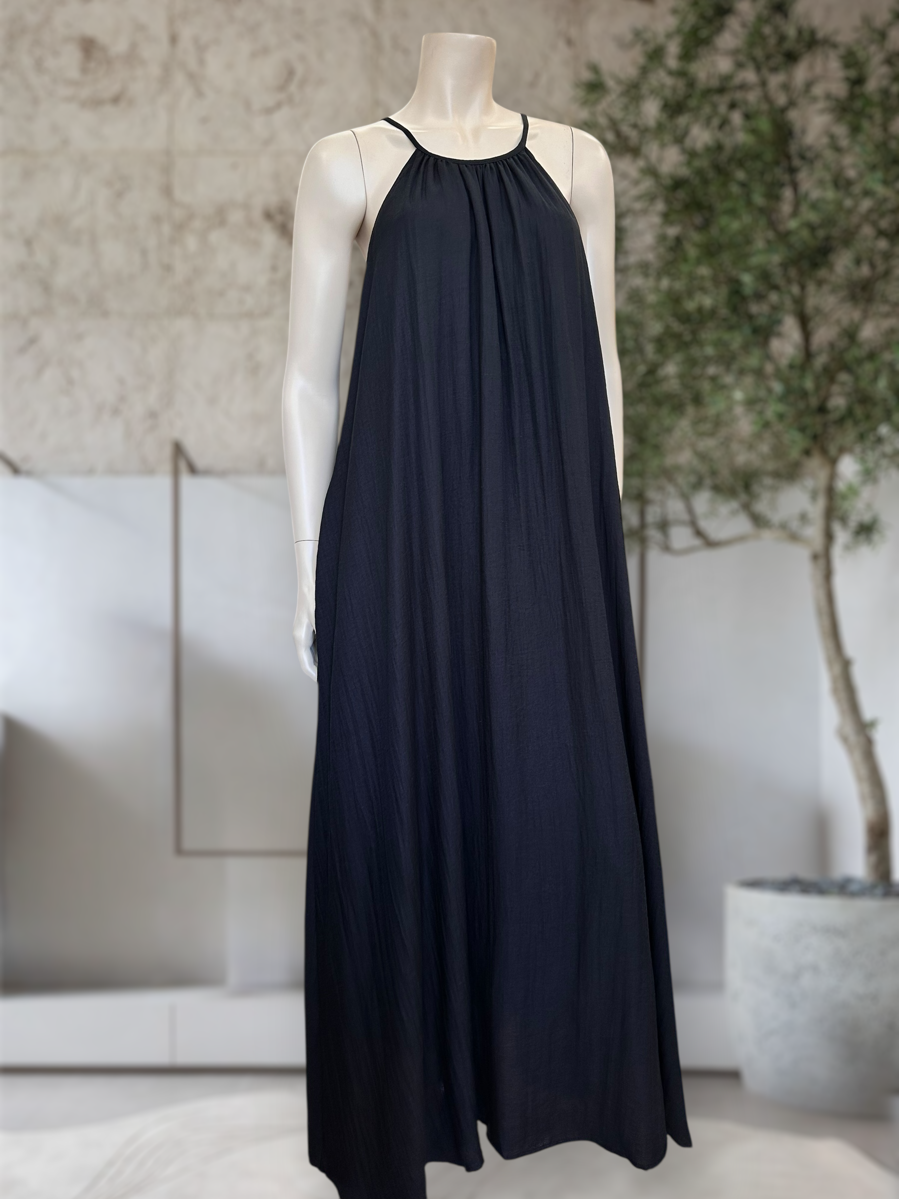 Un vestido largo, fresco y fluido, perfecto para días de verano y noches relajadas. Su diseño halter con espalda descubierta estiliza y aporta un look sofisticado, mientras que su caída amplia lo hace cómodo y favorecedor para distintas tallas. NO INCLUYE CINTURÓN.