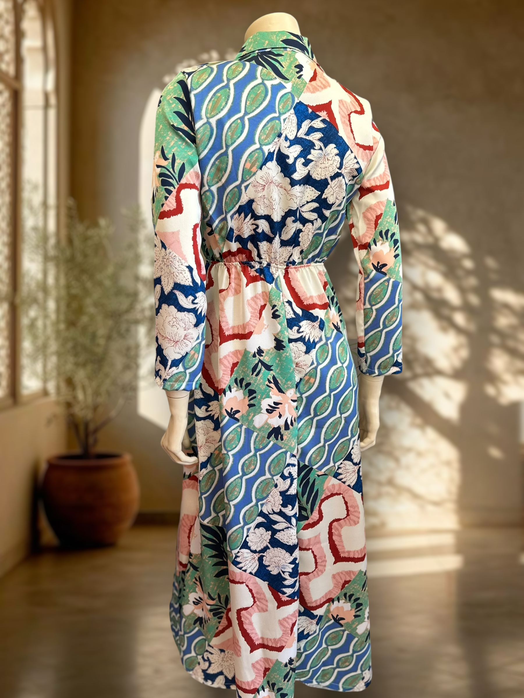 Elegante, liviano y lleno de color. Un vestido camisero con caída fluida, pretina elasticada y estampados únicos que iluminan cualquier look. (El patrón de estampado puede variar levemente de una pieza a otra)