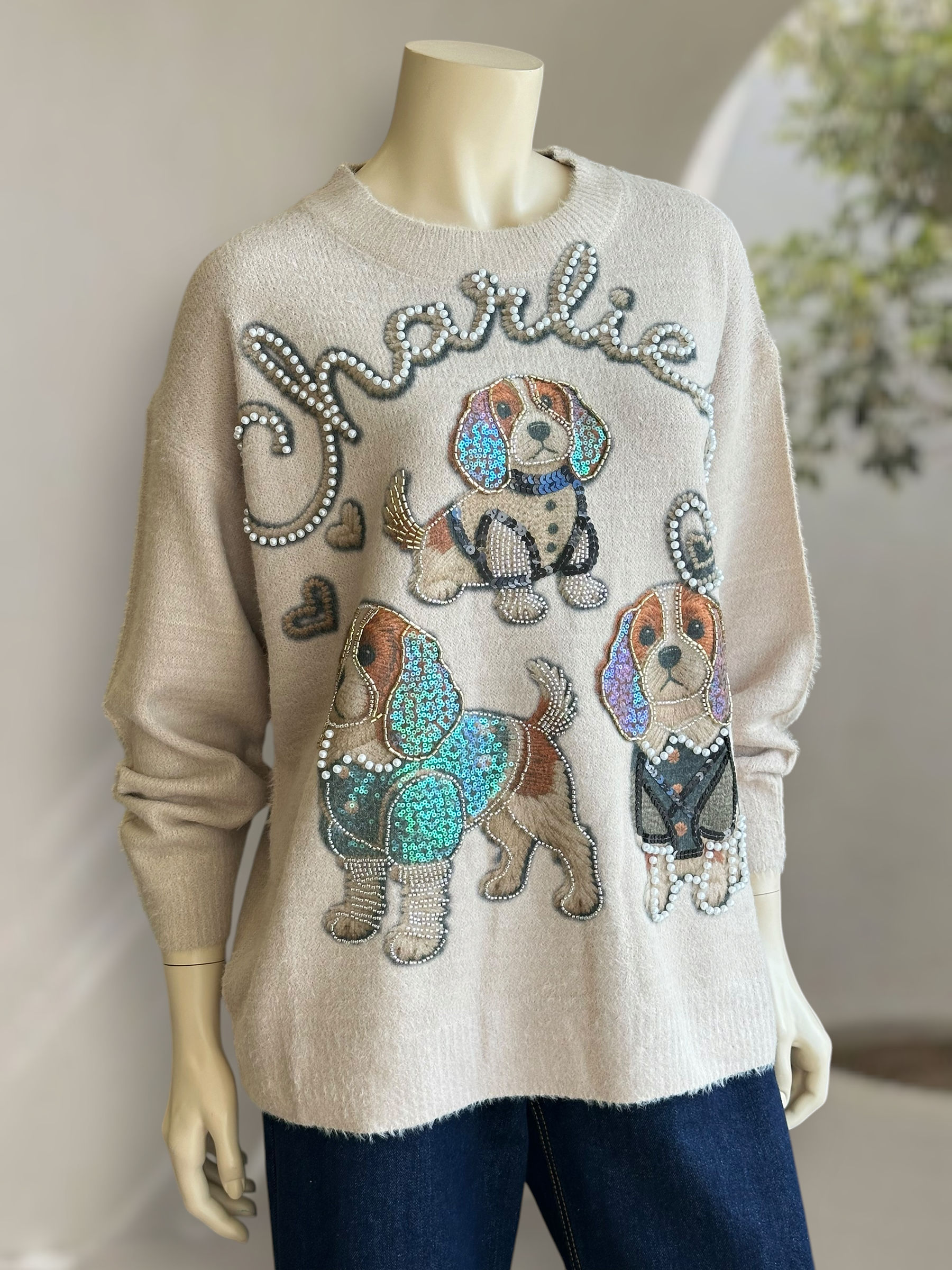 Un sweater con personalidad única 🐶✨ detalles bordados y aplicaciones que elevan cualquier look casual con un toque lúdico y chic.