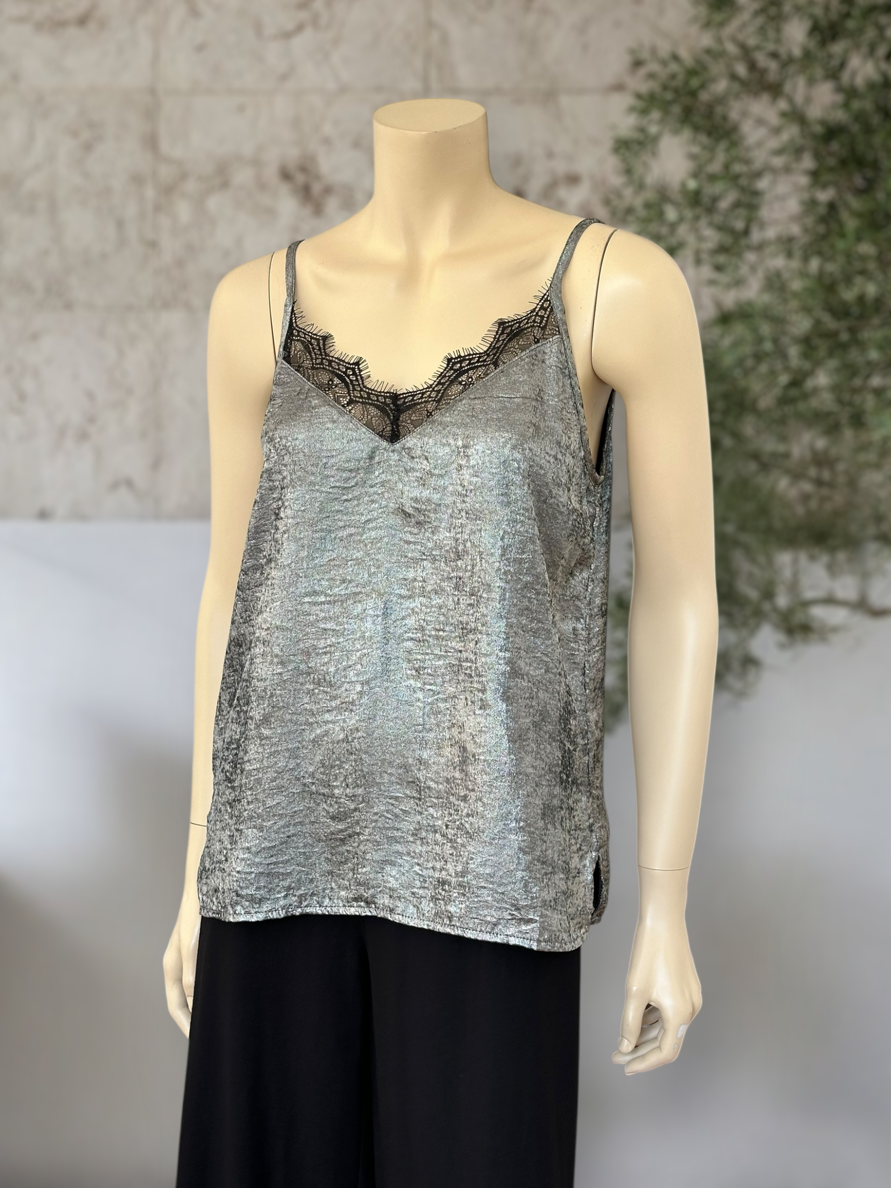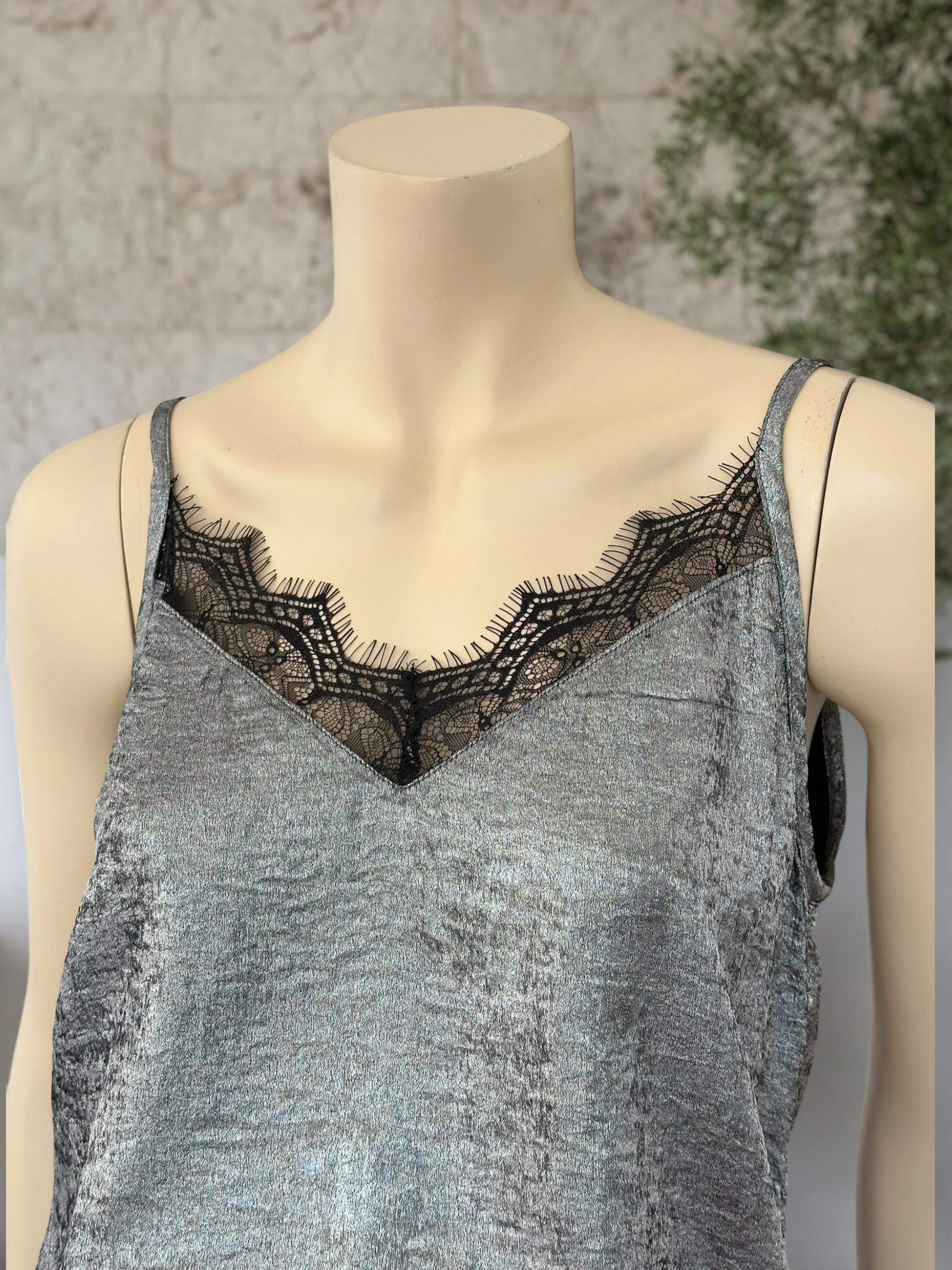 El favorito para brillar en cualquier ocasión. Su caída fluida y detalle de encaje en el escote hacen que este top sea perfecto para outfits de noche, eventos o para elevar un look casual.