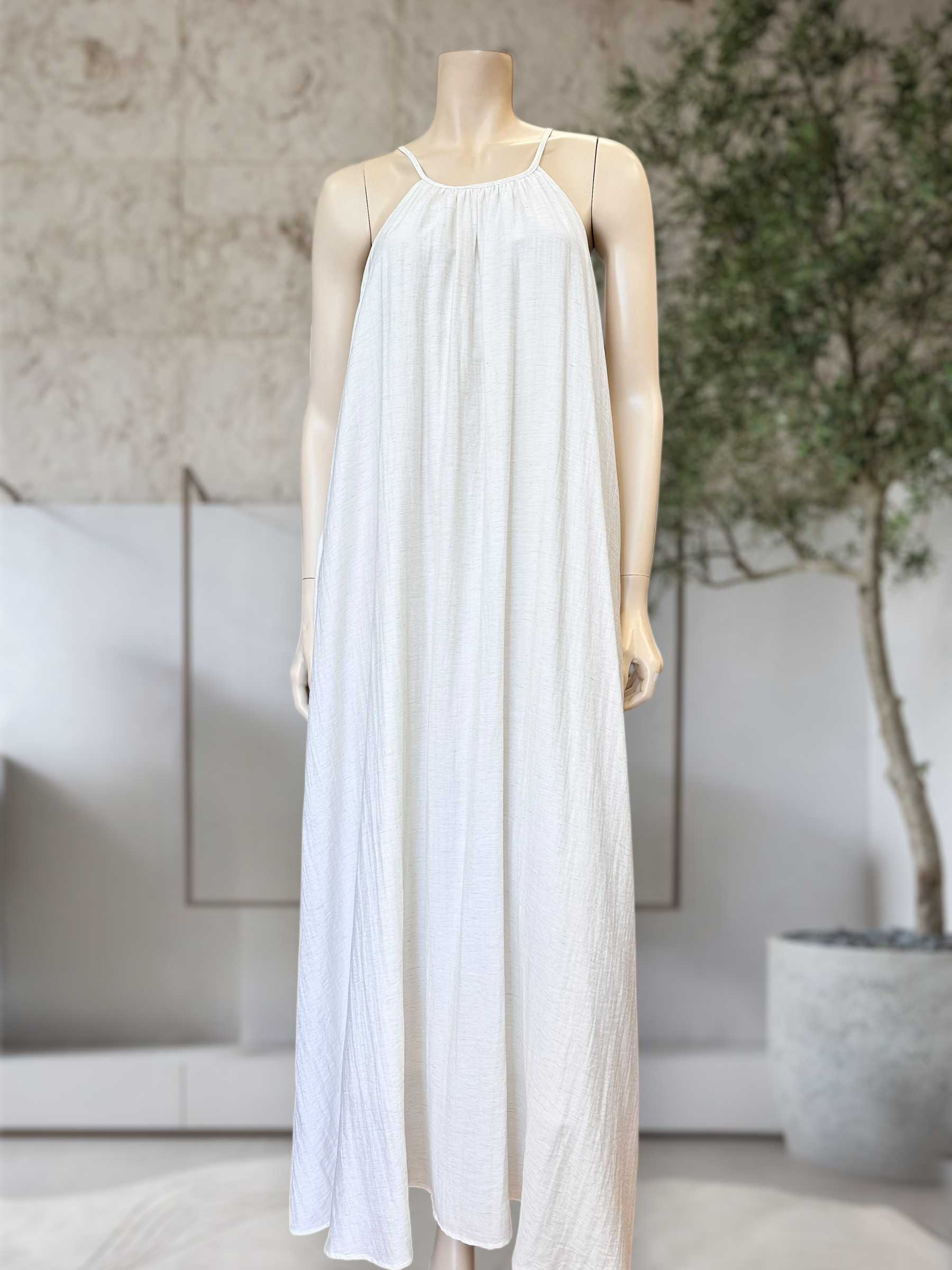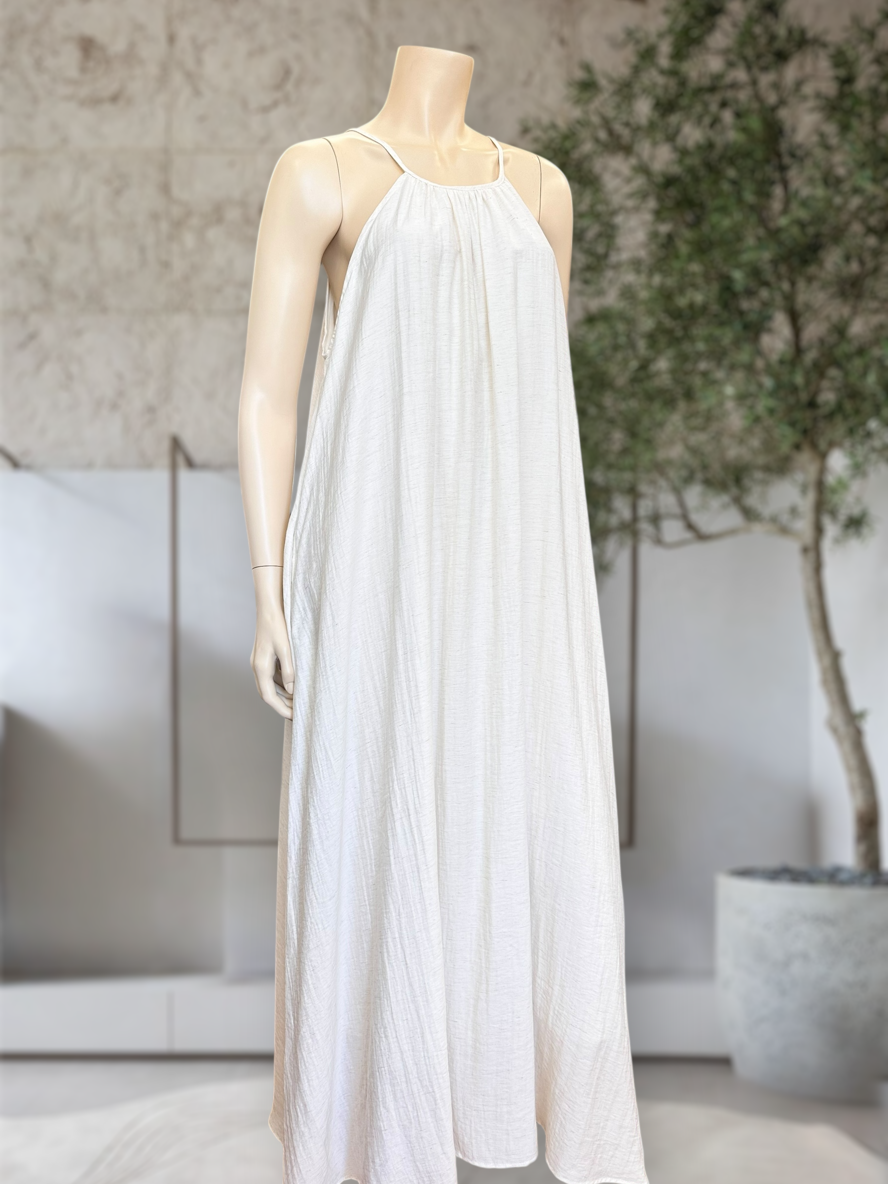 Un vestido largo, fresco y fluido, perfecto para días de verano y noches relajadas. Su diseño halter con espalda descubierta estiliza y aporta un look sofisticado, mientras que su caída amplia lo hace cómodo y favorecedor para distintas tallas. NO INCLUYE CINTURÓN.