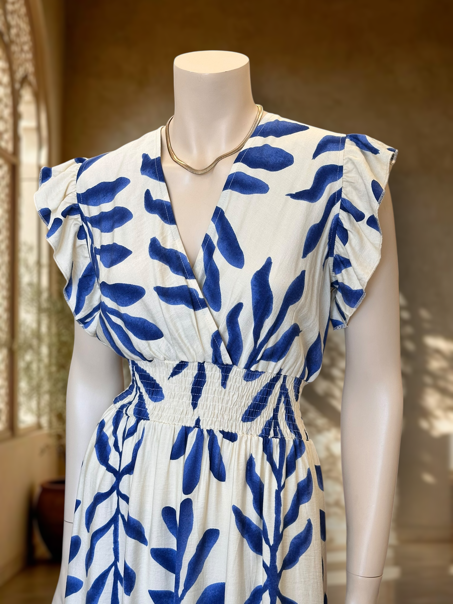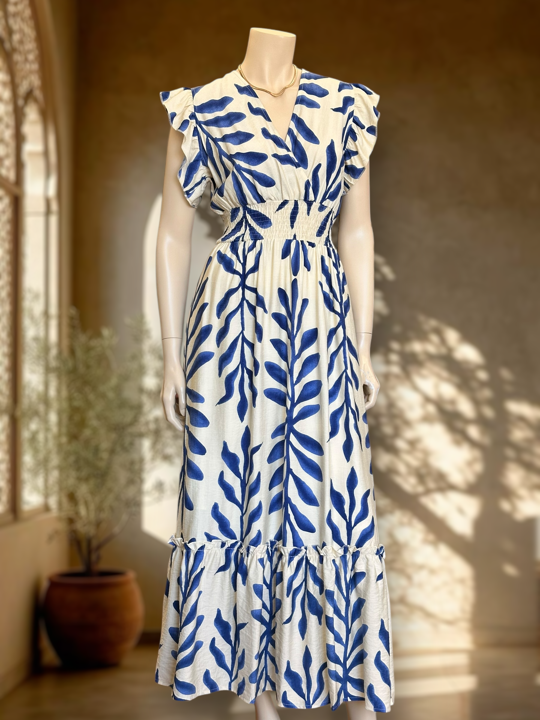 Un vestido largo, liviano y lleno de fluidez, diseñado en viscosa-poliamida para lograr una caída suave y un movimiento elegante. Su estampado botánico destaca sobre el fondo claro, creando un look fresco, luminoso y perfecto para días cálidos.