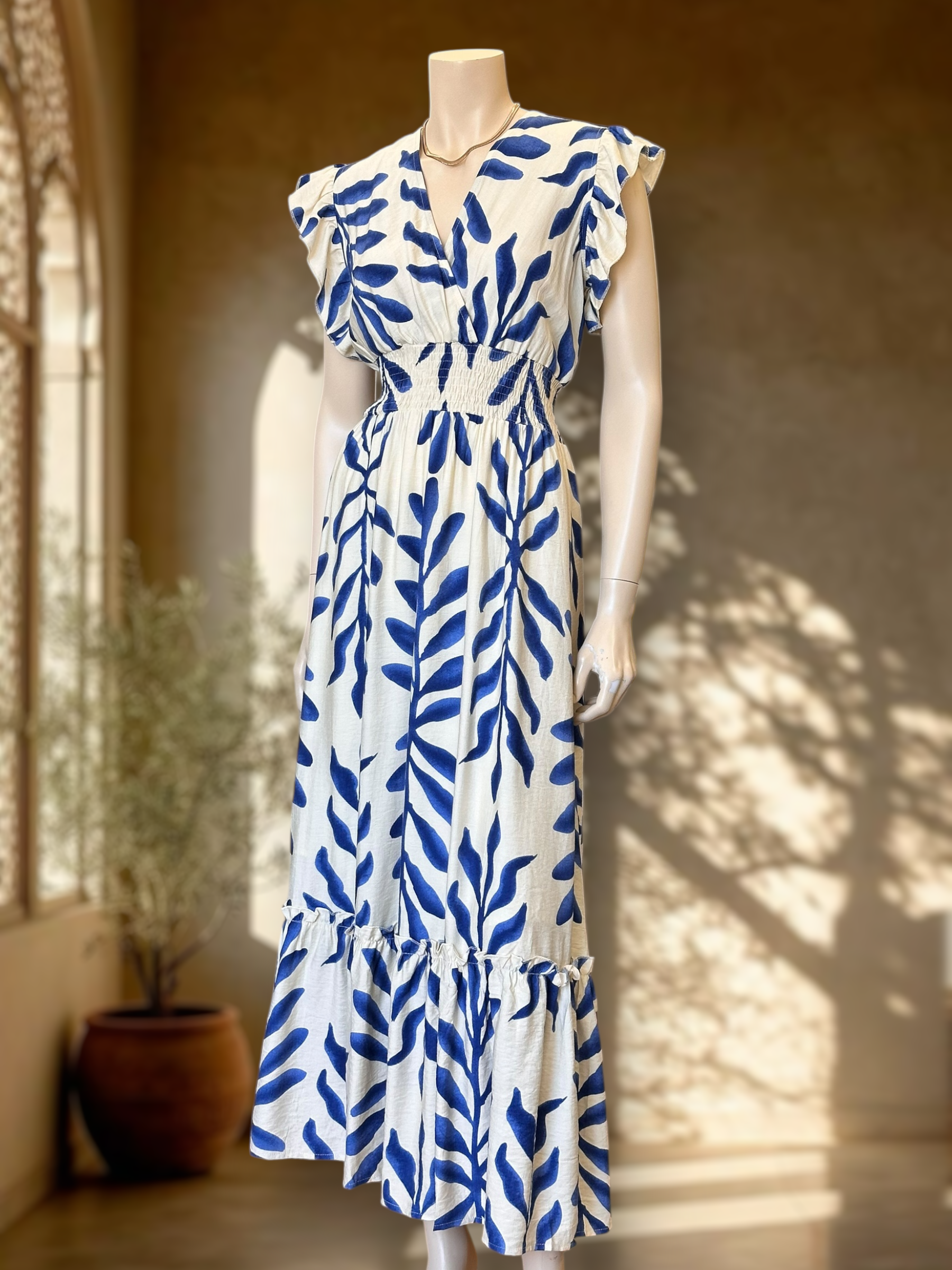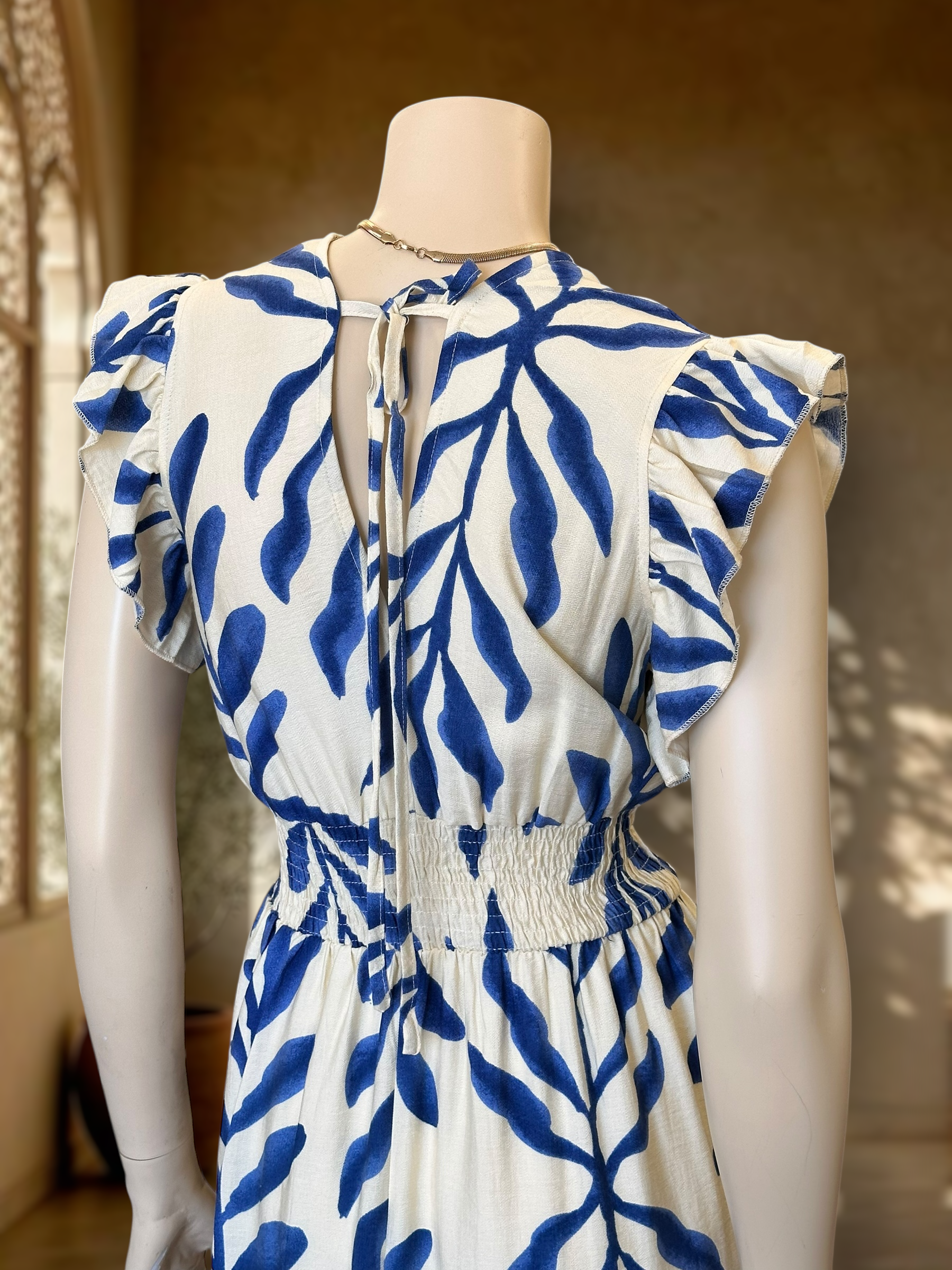 La cintura elasticada se adapta cómodamente a la silueta, mientras que los volantes en hombros y ruedo aportan un toque femenino. La abertura posterior con amarre permite ajustar según tu comodidad.