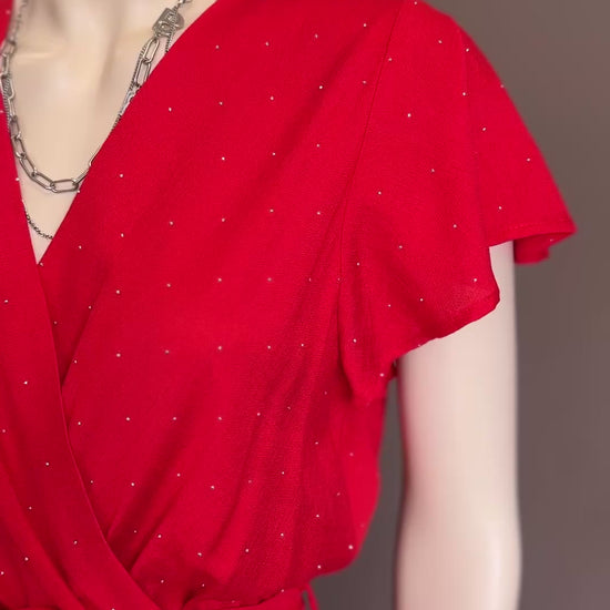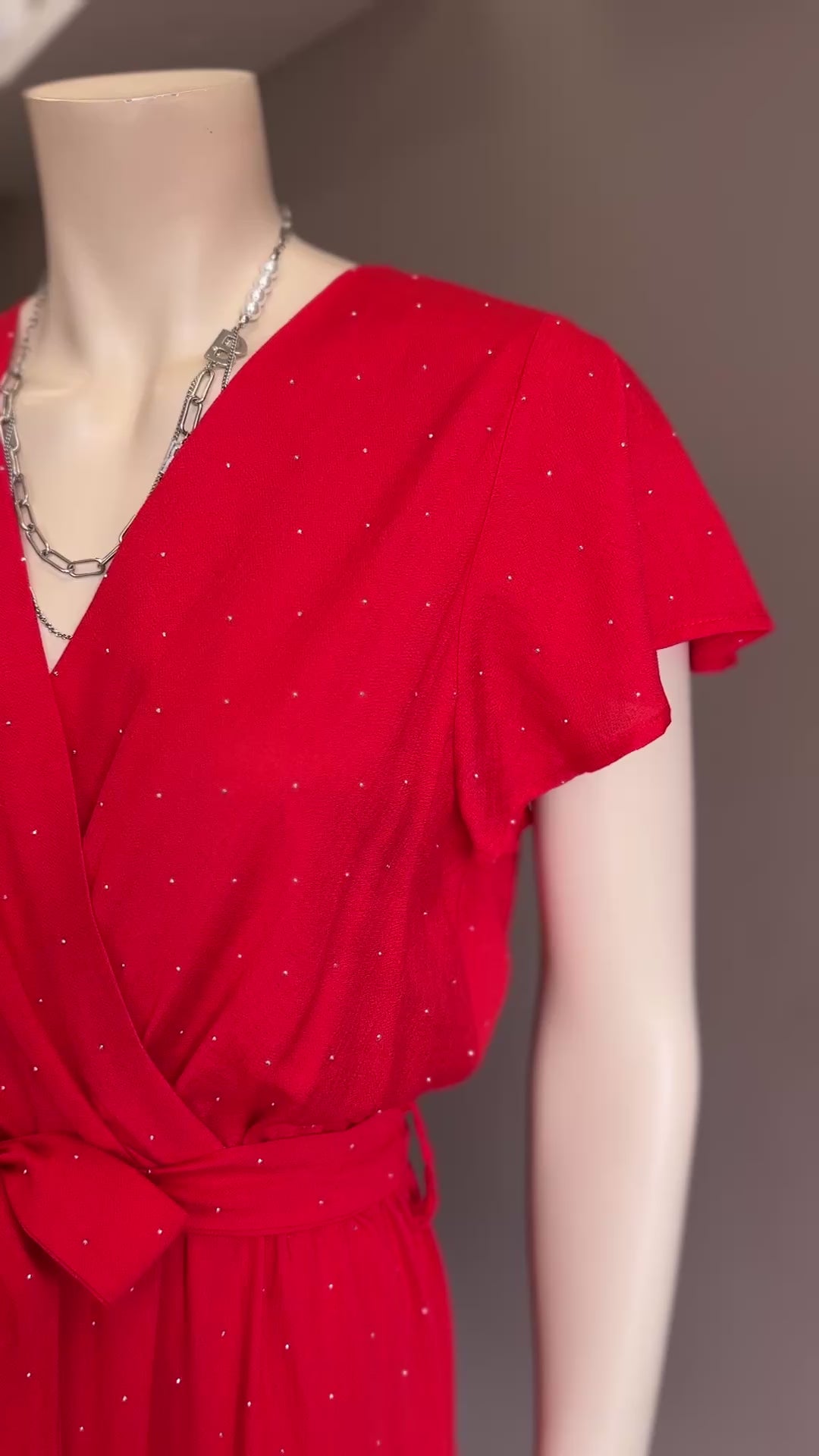 Elegante y femenino, este vestido de diseño italiano destaca por su brillo sutil y corte cruzado que realza la silueta. Su cintura elasticada se ajusta cómodamente, ofreciendo un calce favorecedor y fluido.