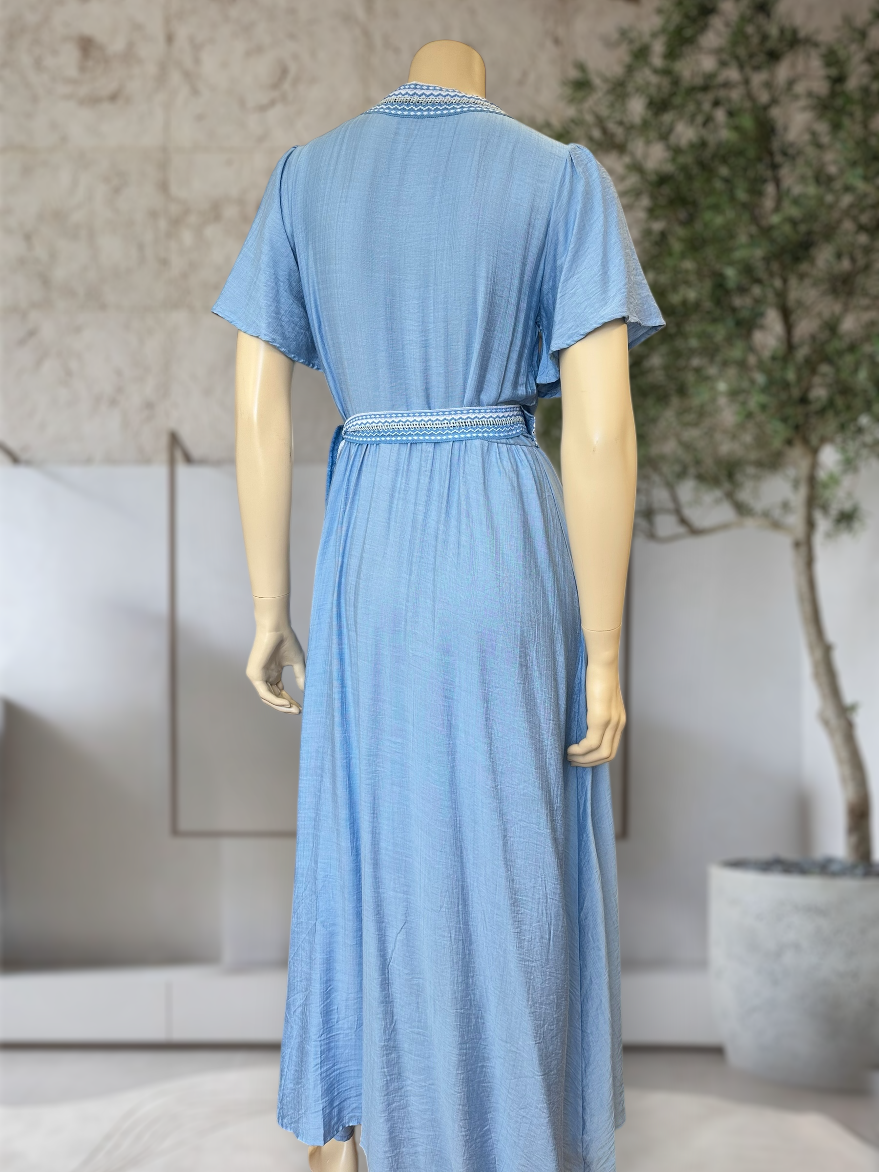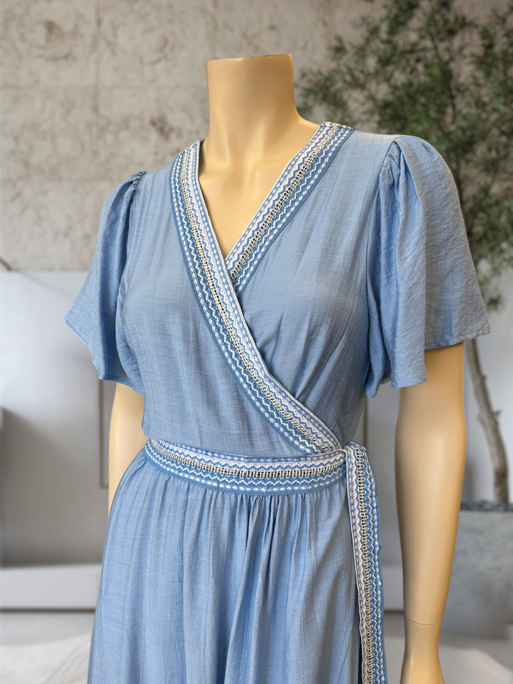 Vestido largo y fluido con diseño cruzado, mangas sueltas y detalle tejido en escote y cintura. Fresco, cómodo y perfecto para un look femenino y estilizado.