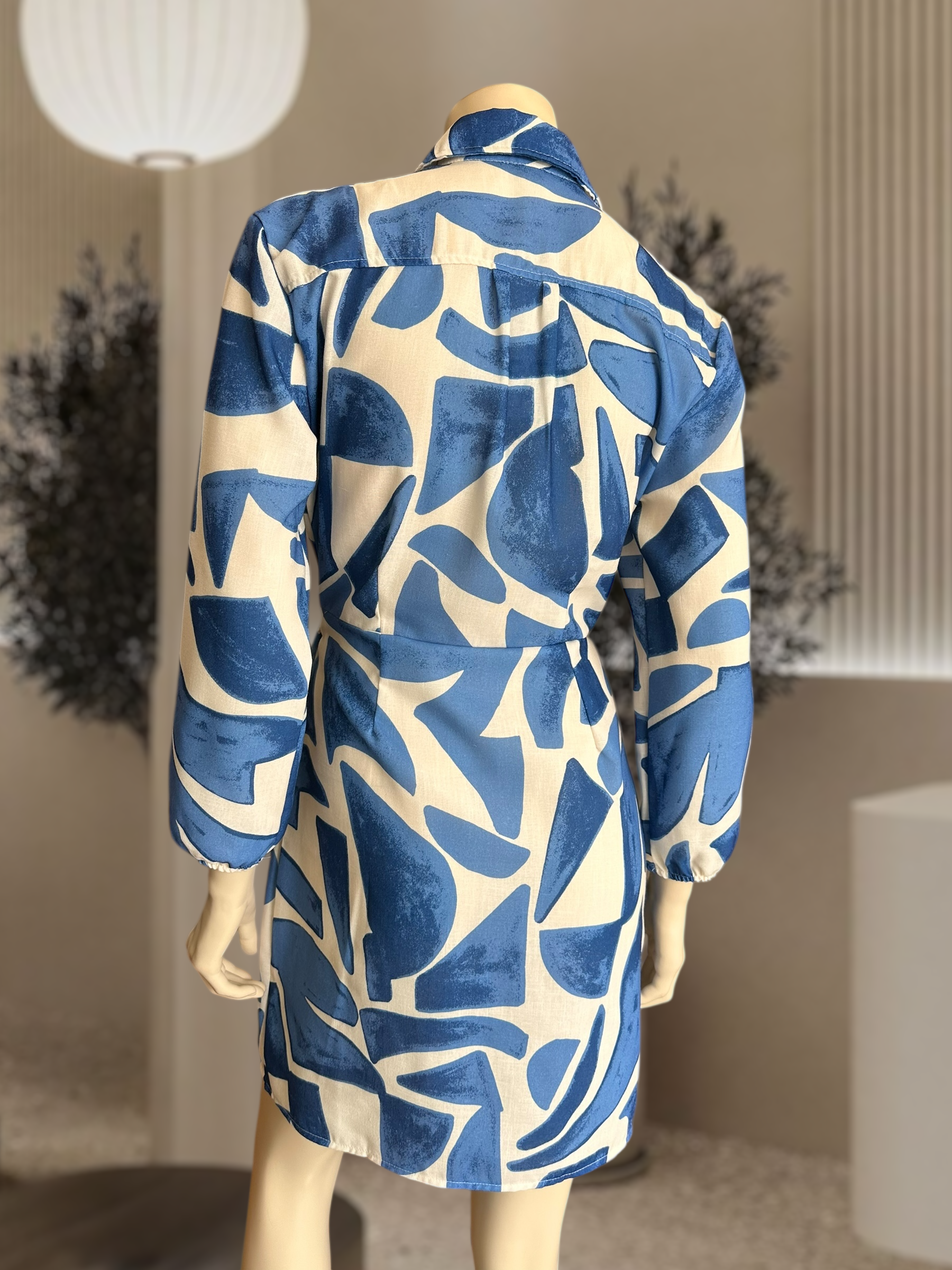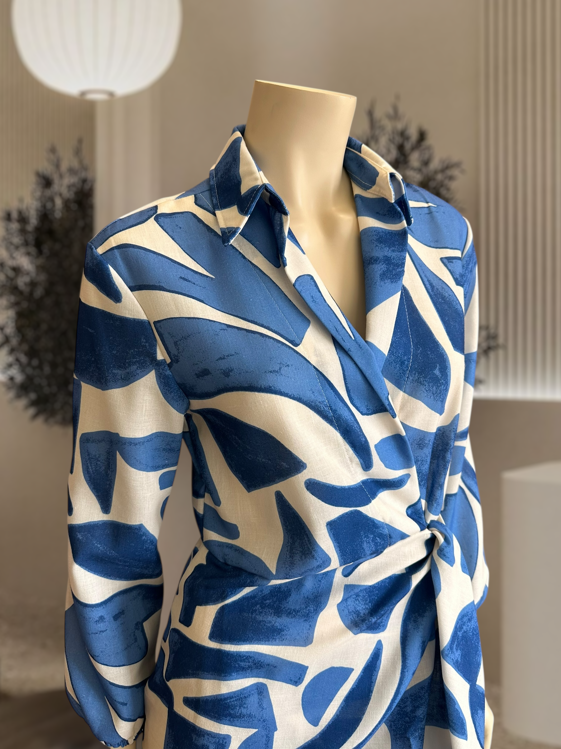 Vestido camisero cruzado con amarre a la cintura, confeccionado en tela Look Lino de textura liviana y caída natural. Ideal para looks de día o noche, con un toque sofisticado y moderno.