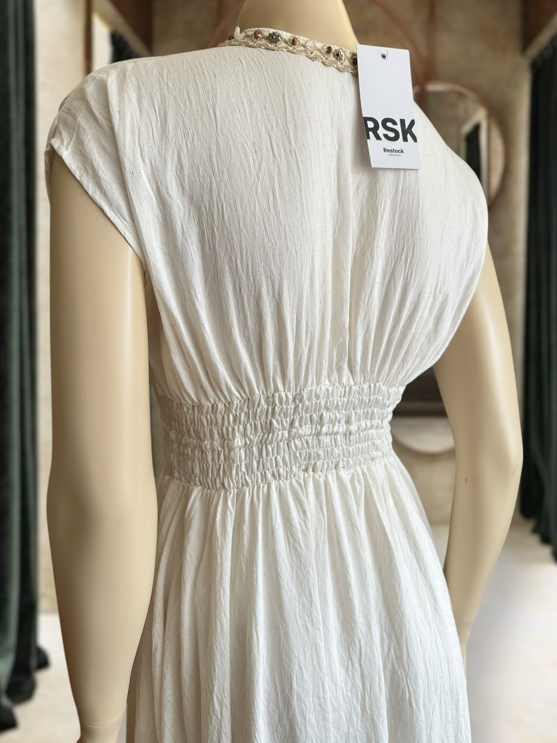 Vestido largo con detalle pedrería bordado en el escote y ajuste en la cintura. Su mezcla de rayón, poliamida y lino le da una caída liviana y fresca, ideal para días de sol o eventos especiales.