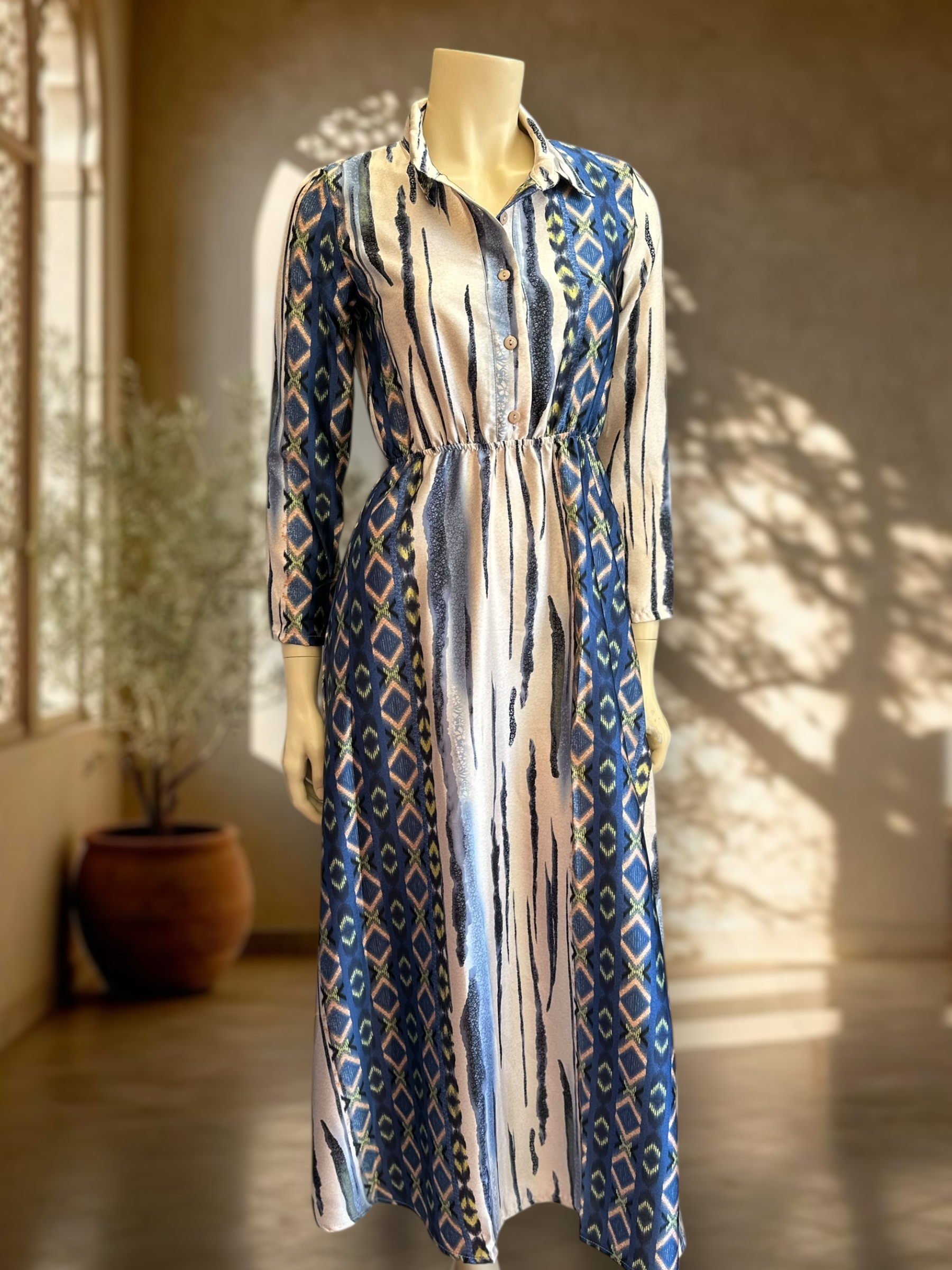 Elegante, liviano y lleno de color. Un vestido camisero con caída fluida, pretina elasticada y estampados únicos que iluminan cualquier look. (El patrón de estampado puede variar levemente de una pieza a otra)