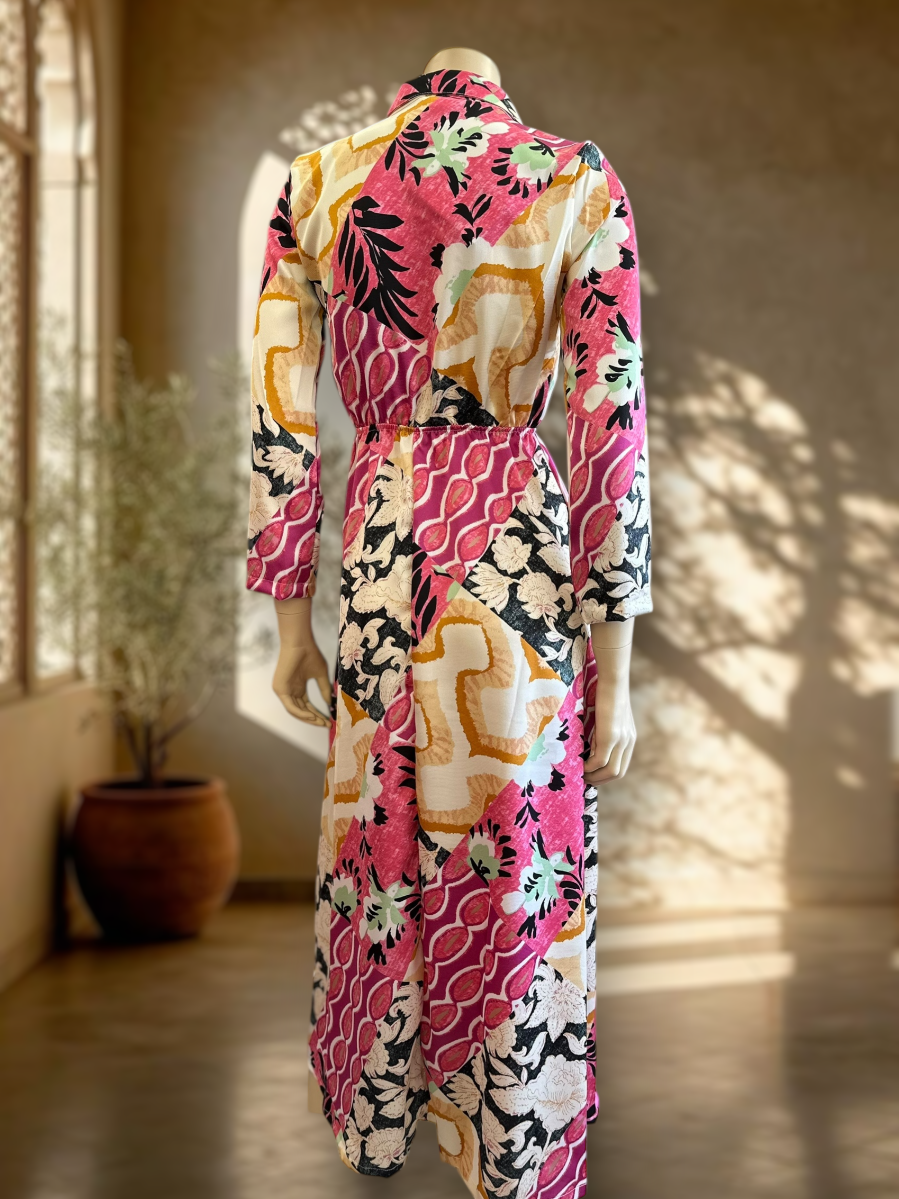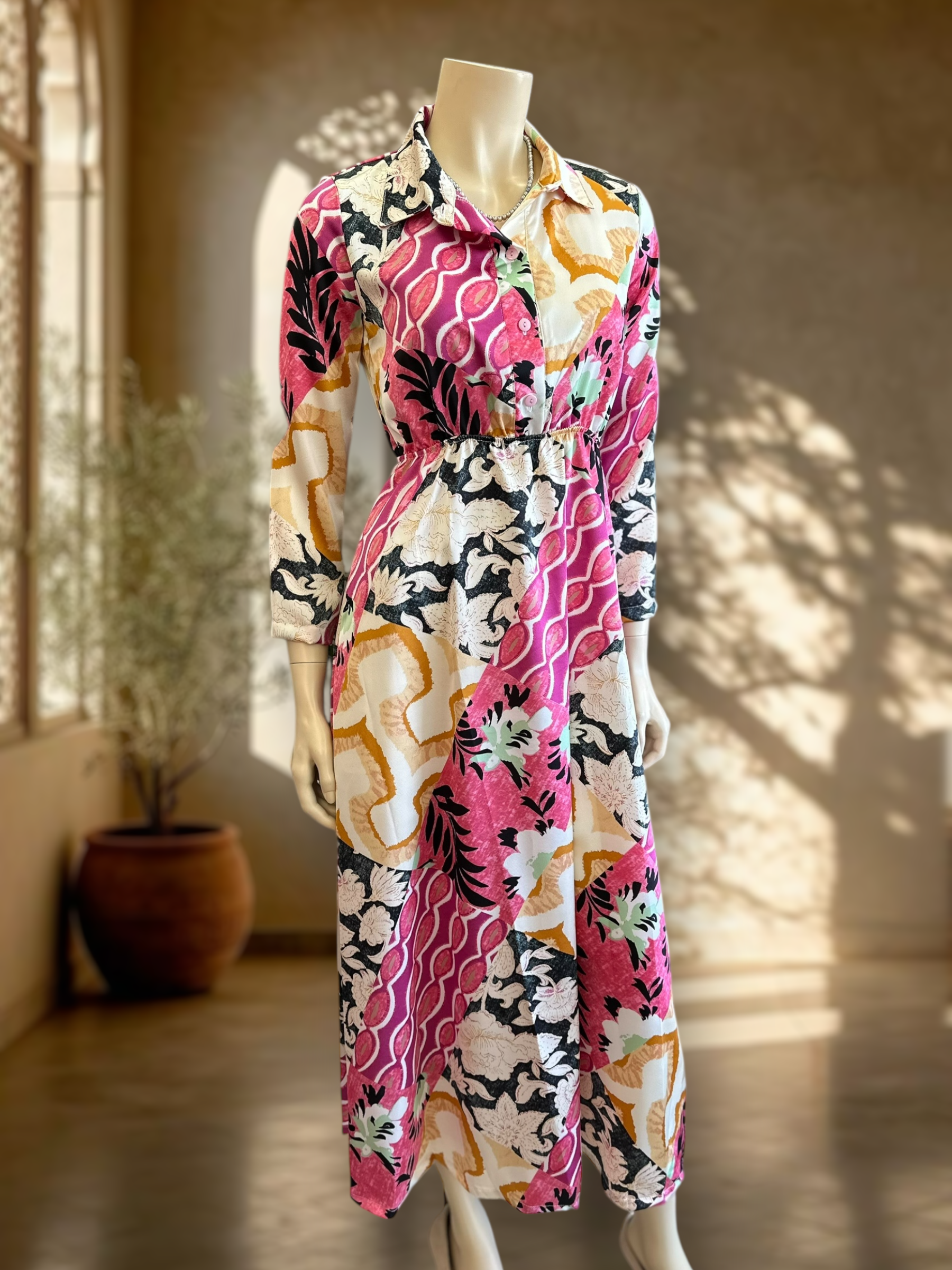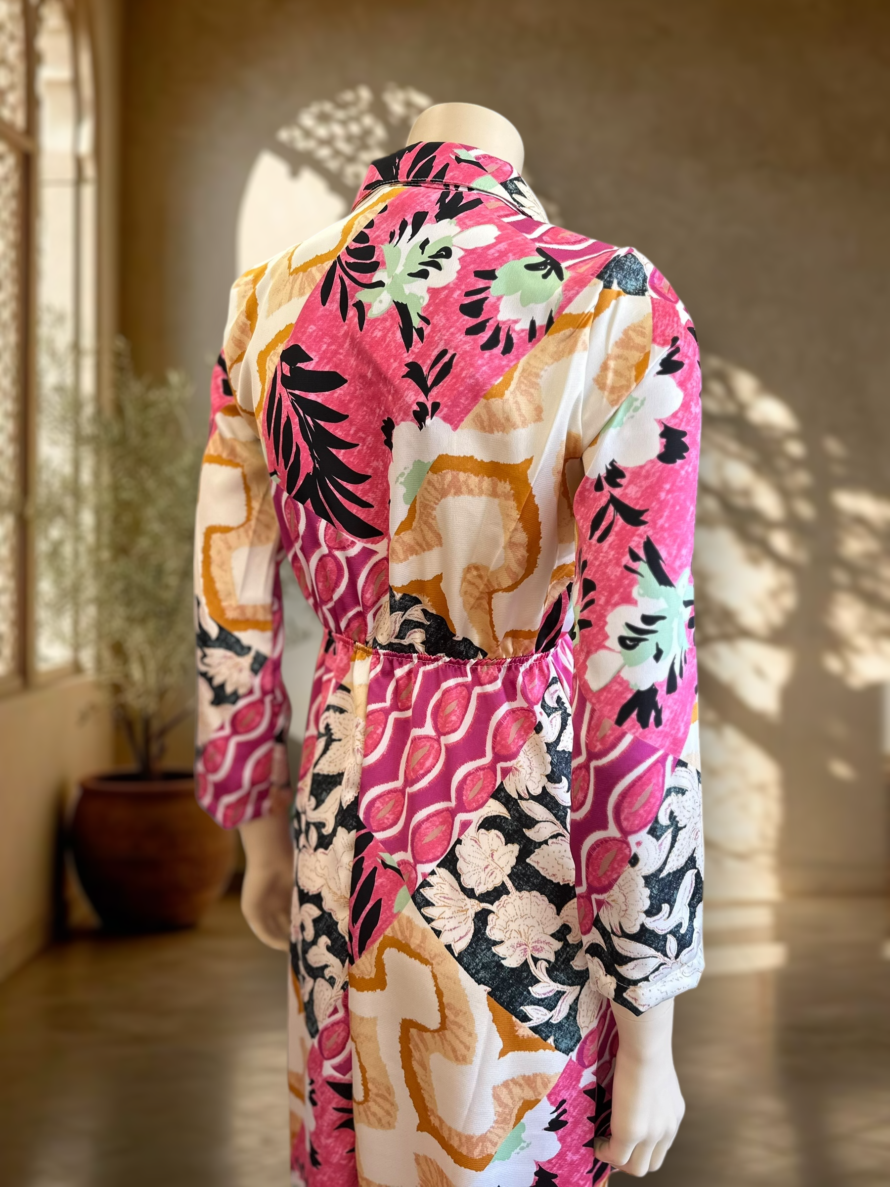 Elegante, liviano y lleno de color. Un vestido camisero con caída fluida, pretina elasticada y estampados únicos que iluminan cualquier look. (El patrón de estampado puede variar levemente de una pieza a otra)