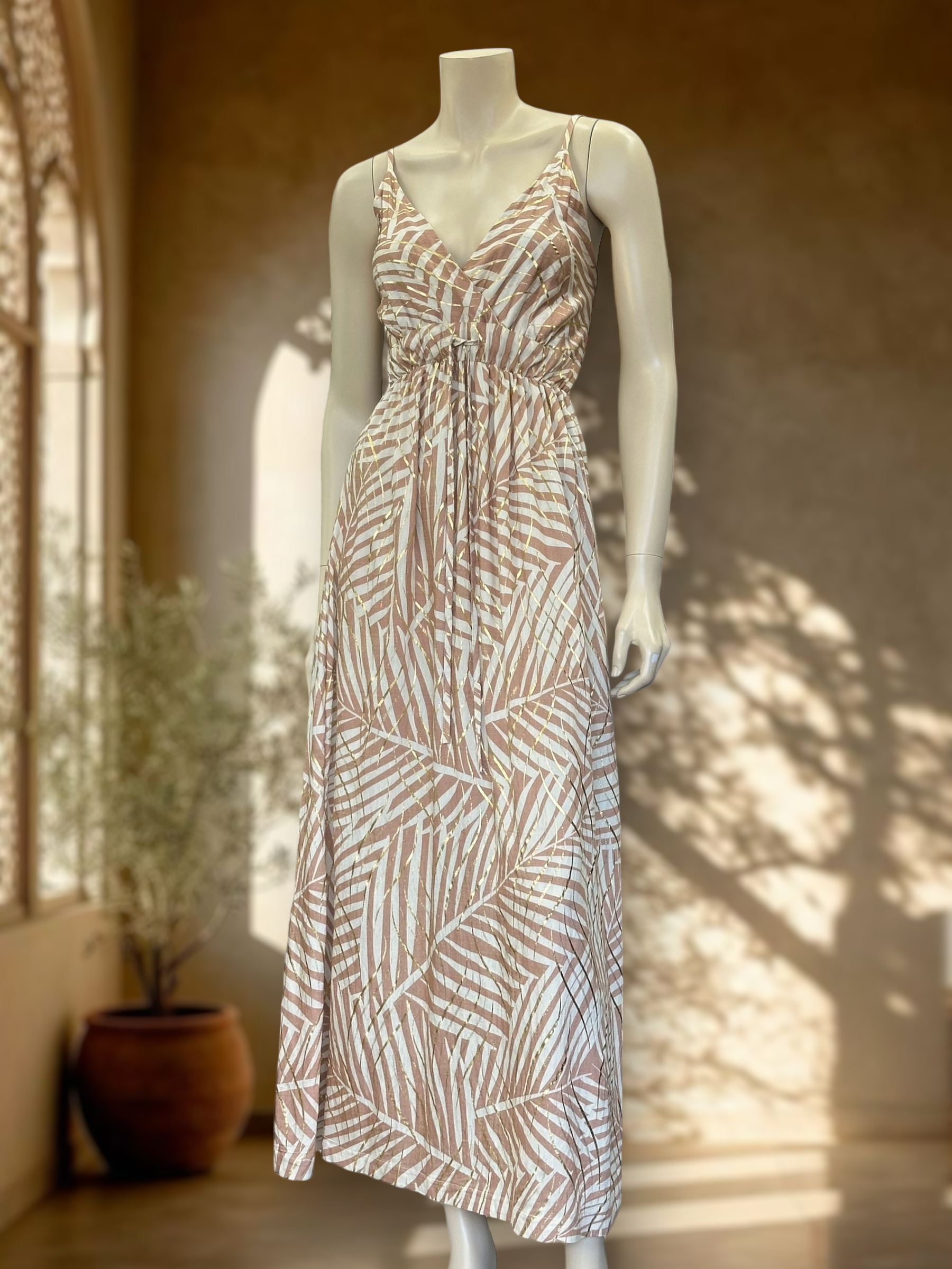 Un maxi vestido fresco, liviano y perfecto para este clima. Su print de hojas con destellos dorados aporta un toque elegante y veraniego a la vez.